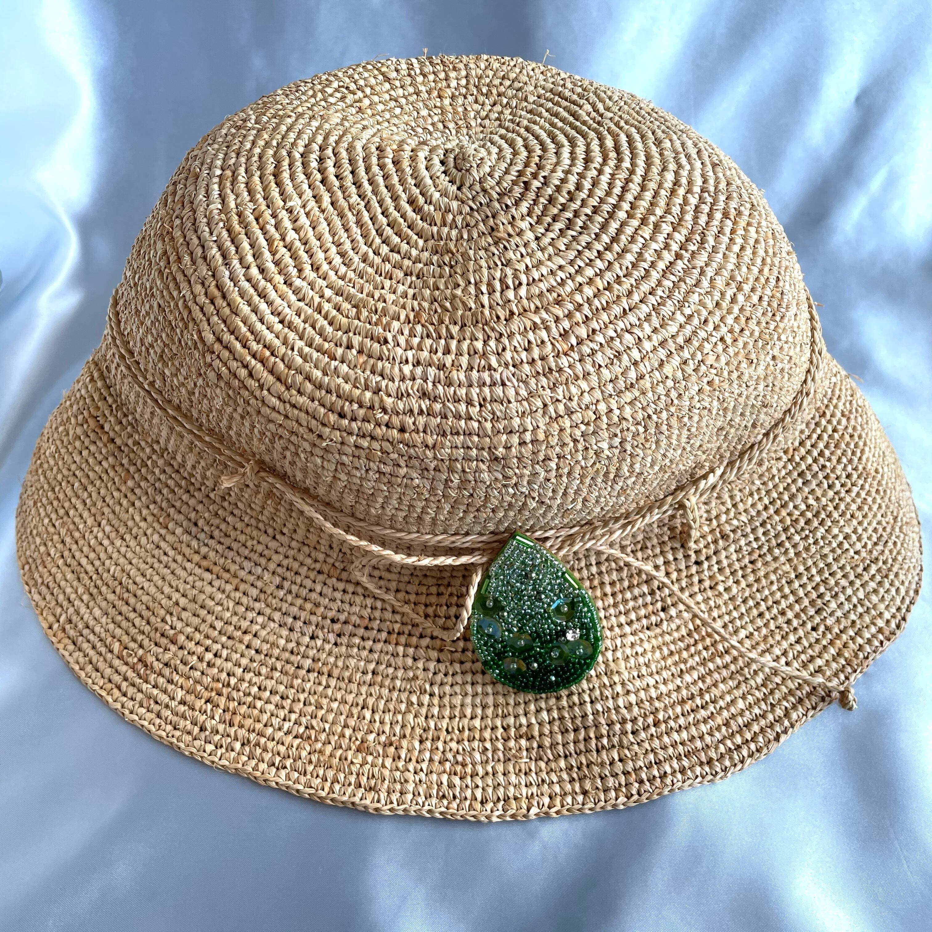 緑の葉っぱからピチョンと落ちてくる雨粒のイメージで、グリーンのビーズを一粒一粒丁寧に刺繍しました