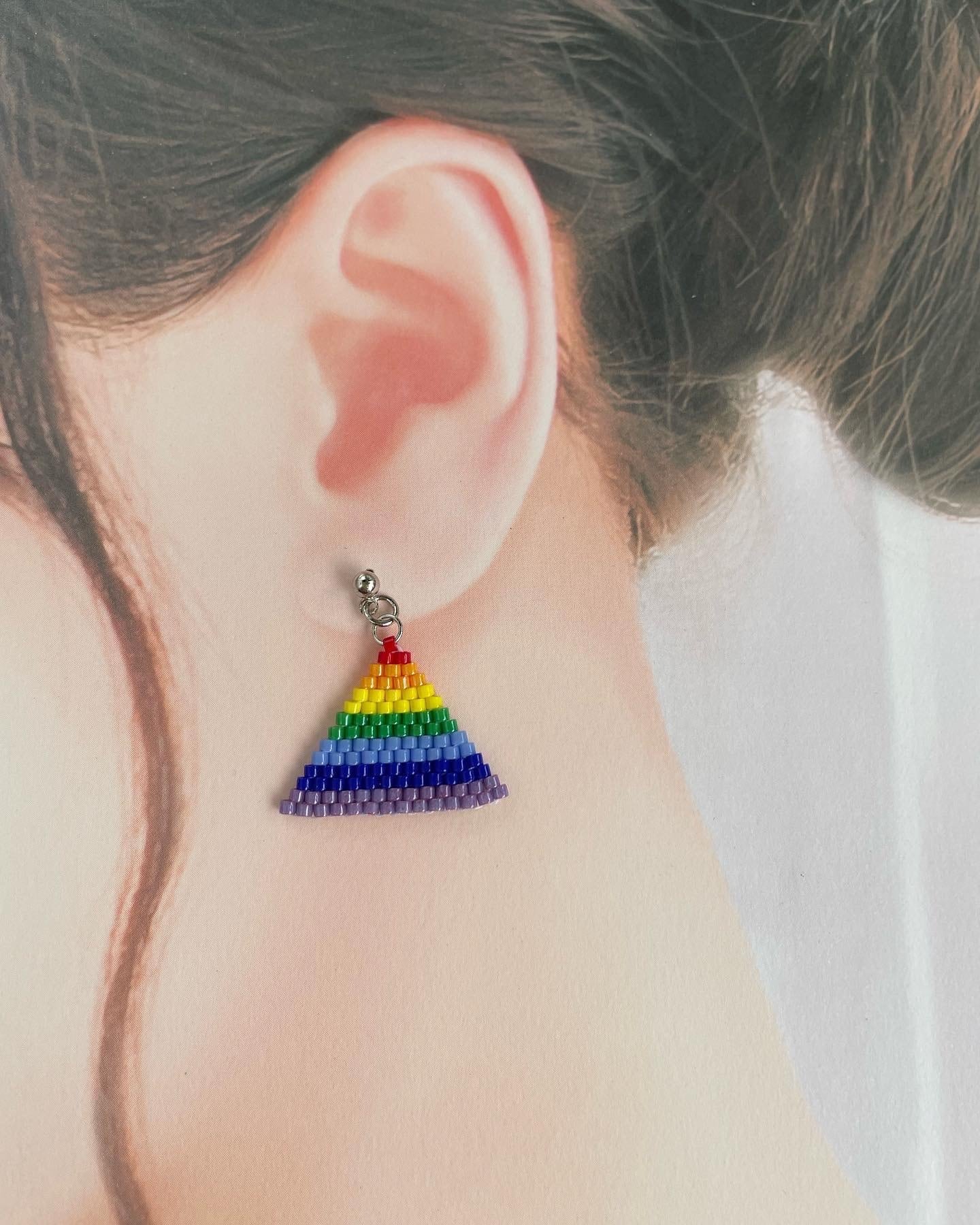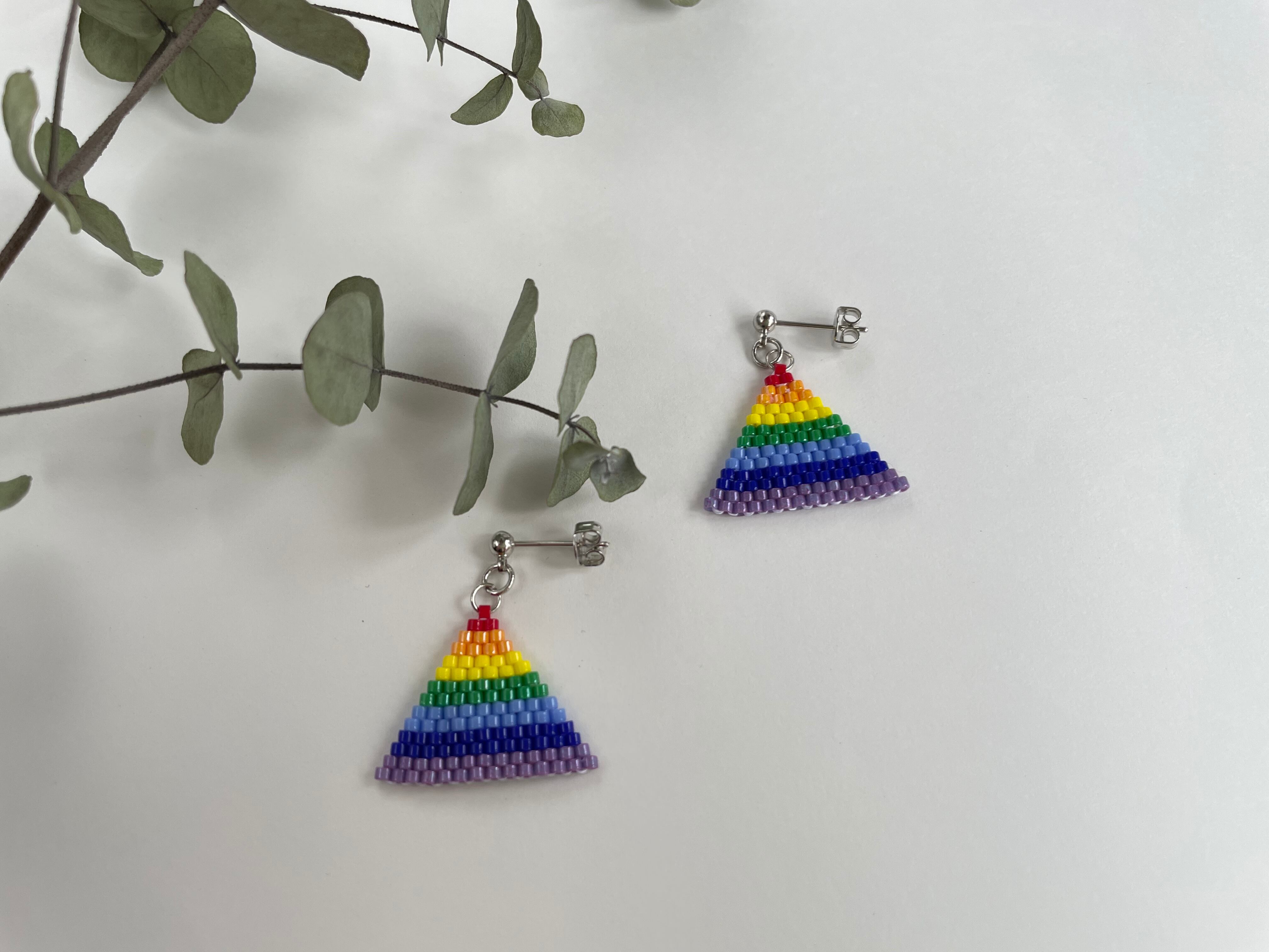元気になれそうなレインボーカラーのサンカクのピアス(イヤリング)です