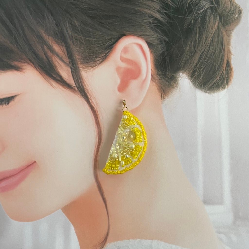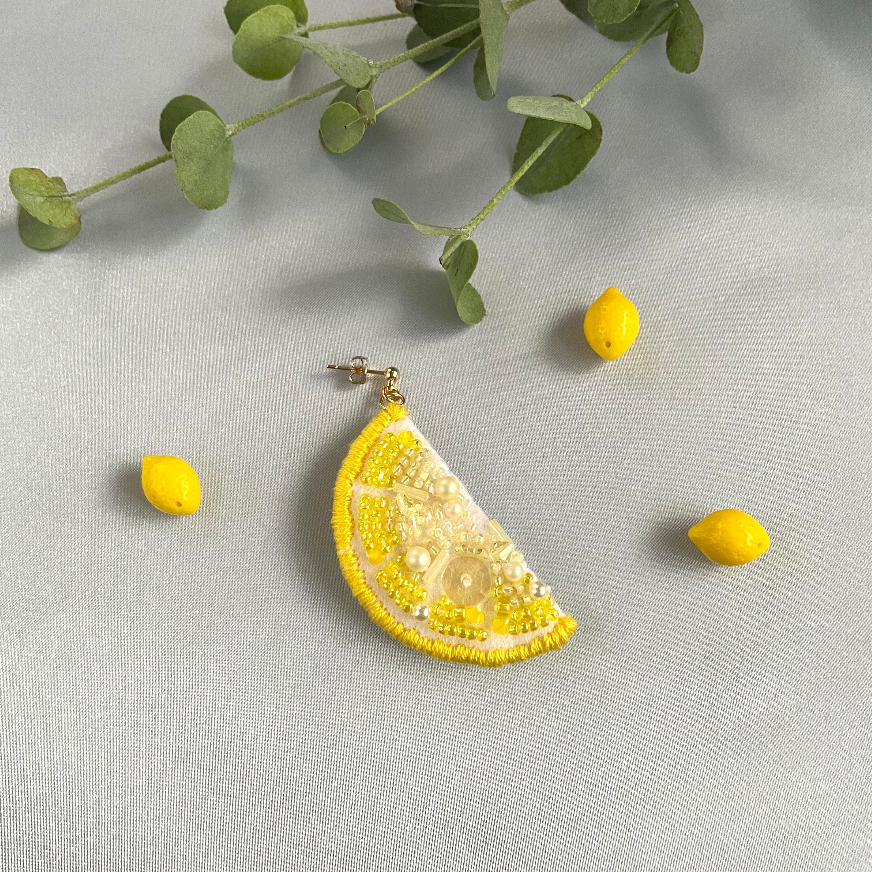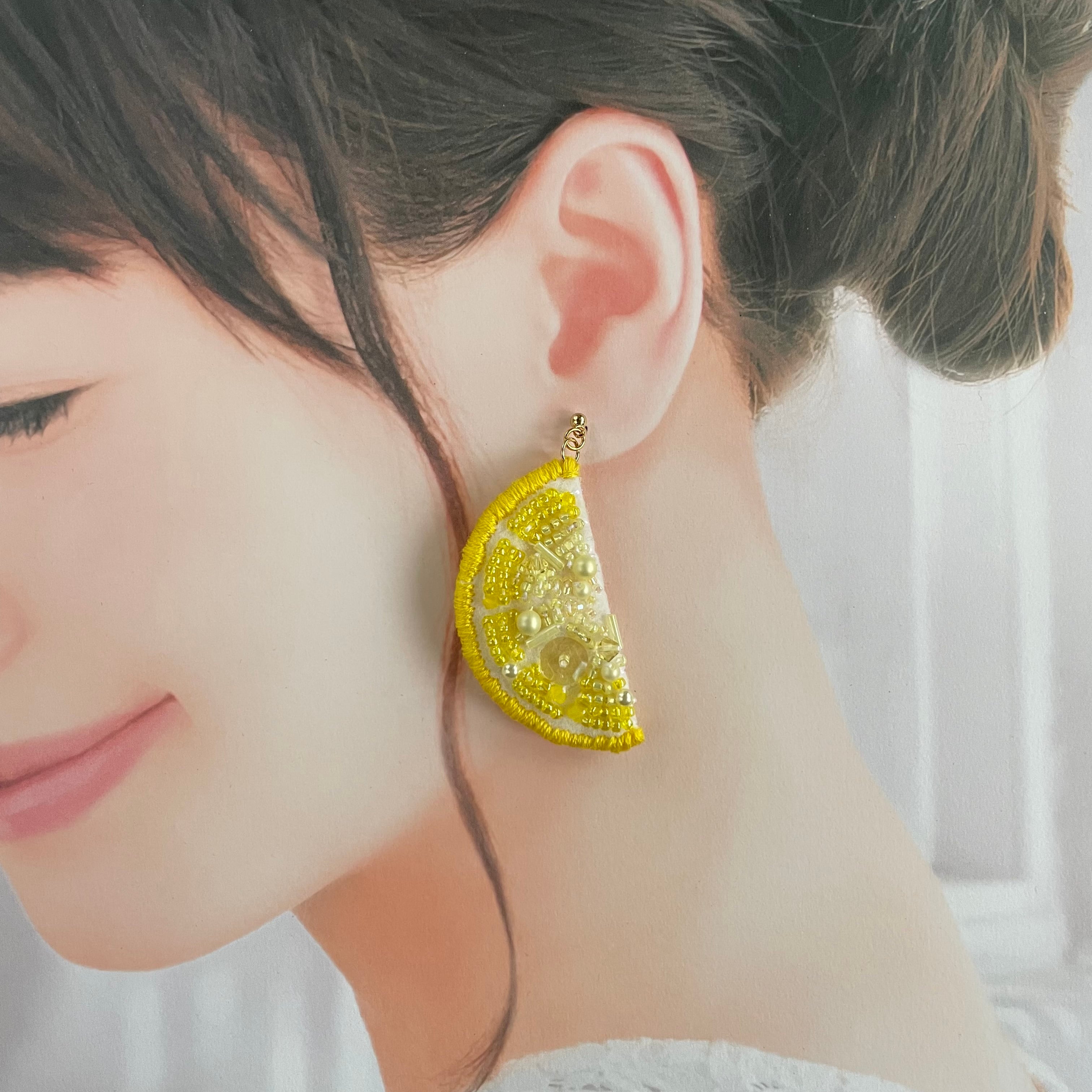 レモンスライスのビーズ刺繍ピアス(片耳用)