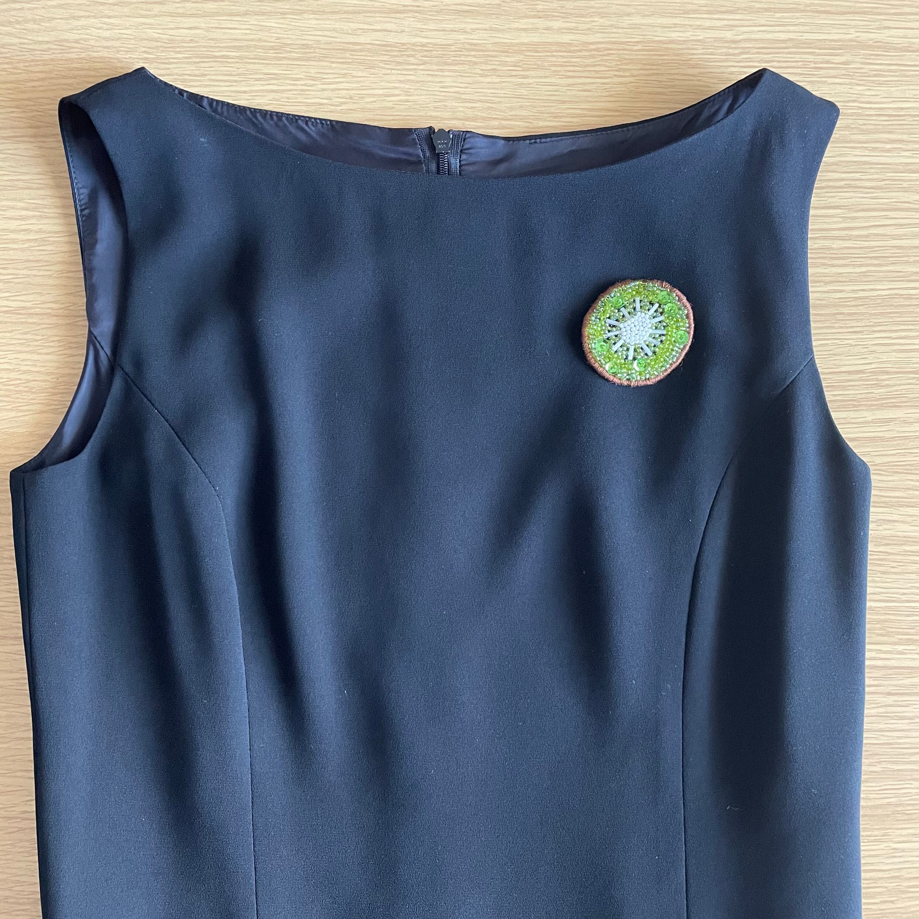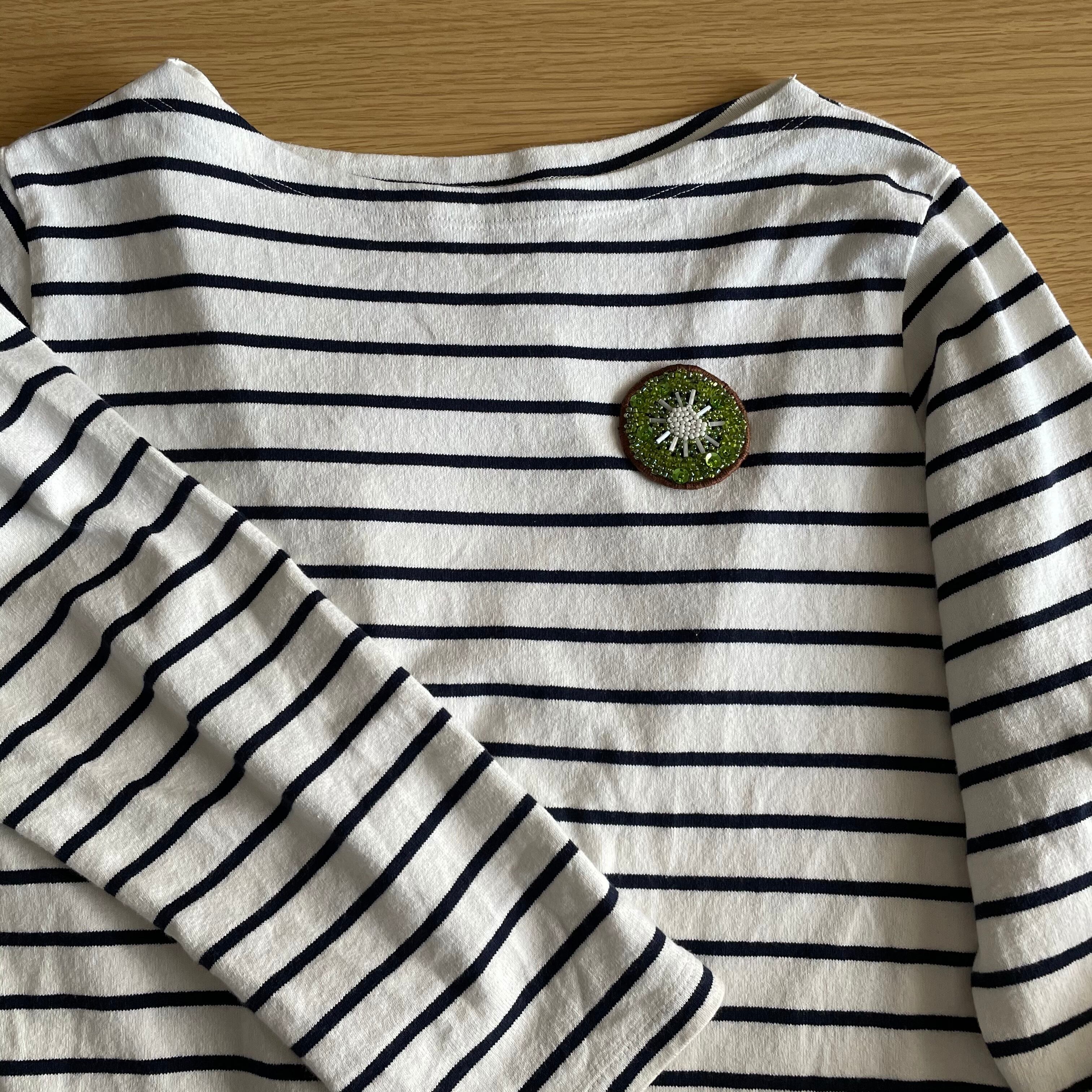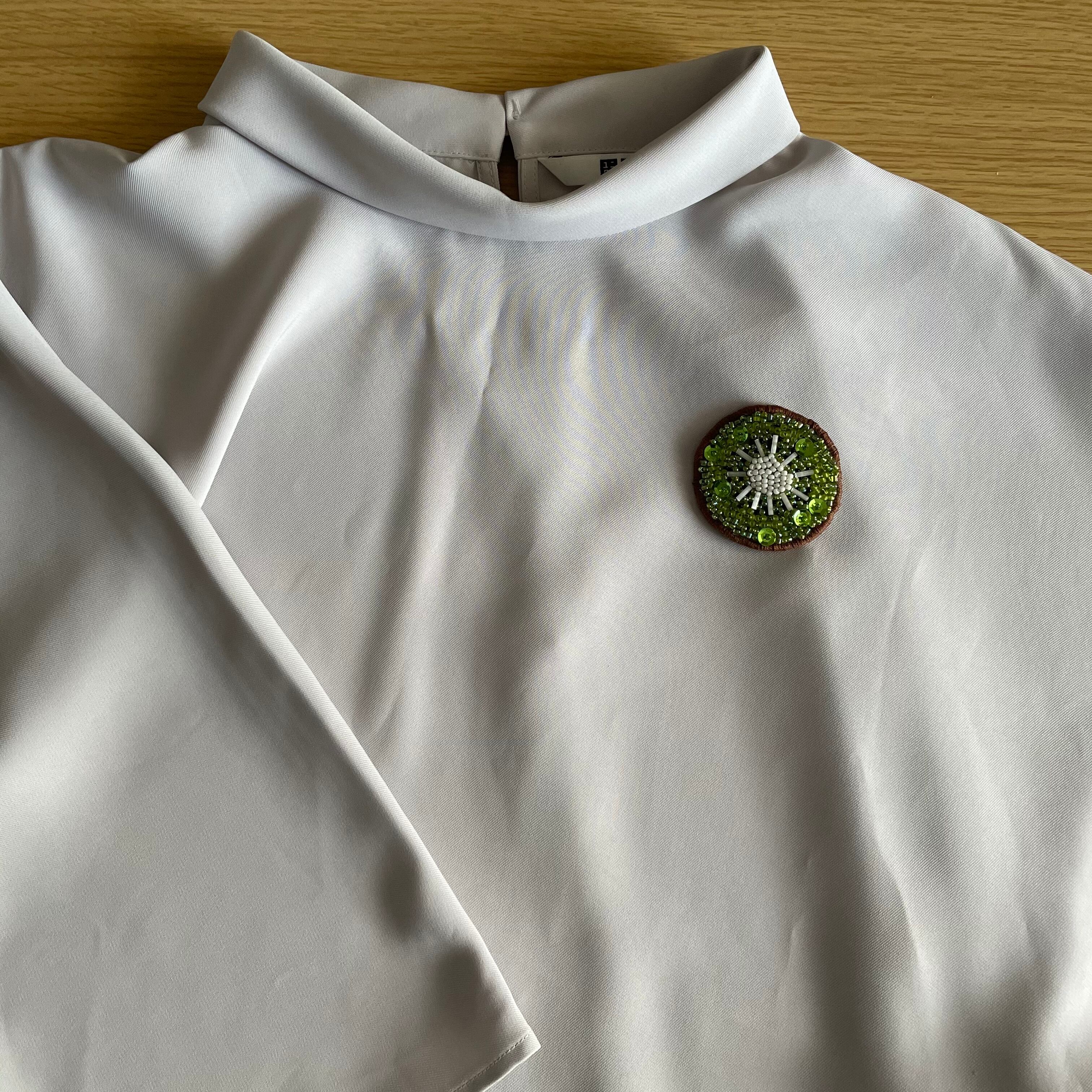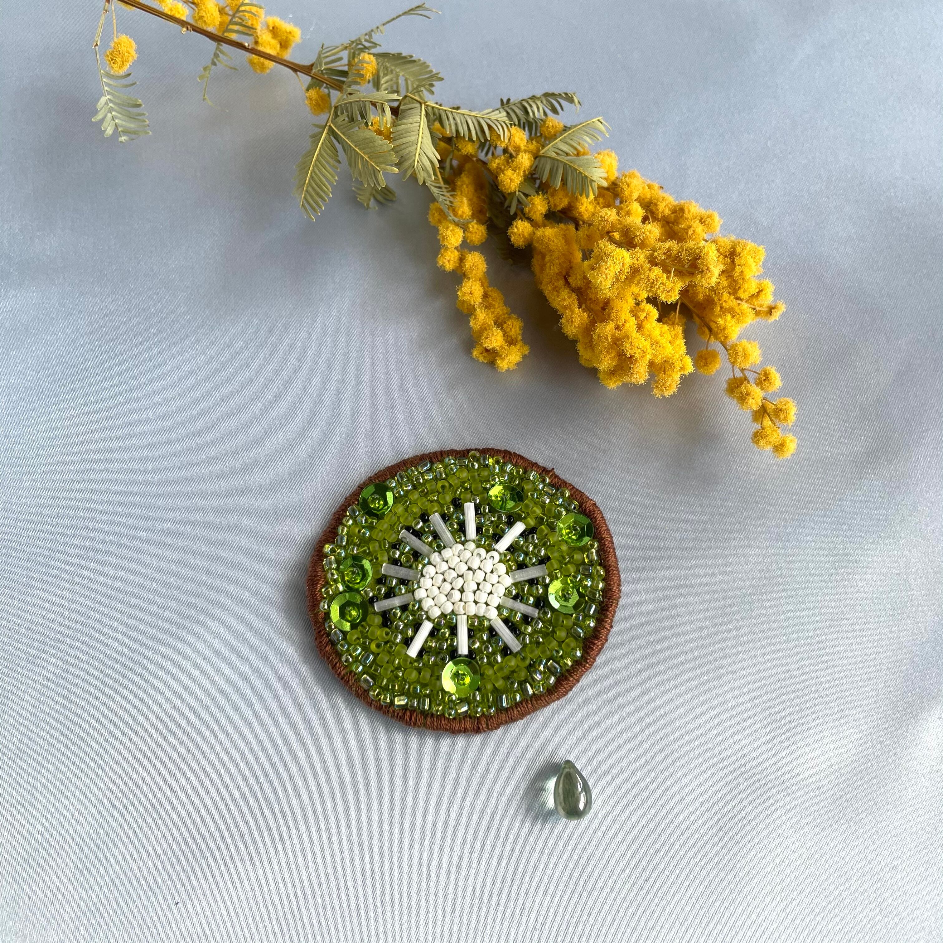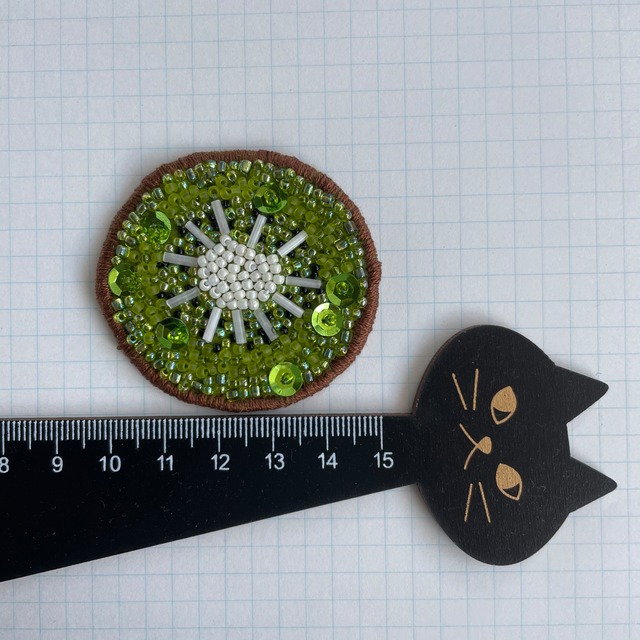 フレッシュなキウイのブローチを、ビーズと刺繍糸で製作しました