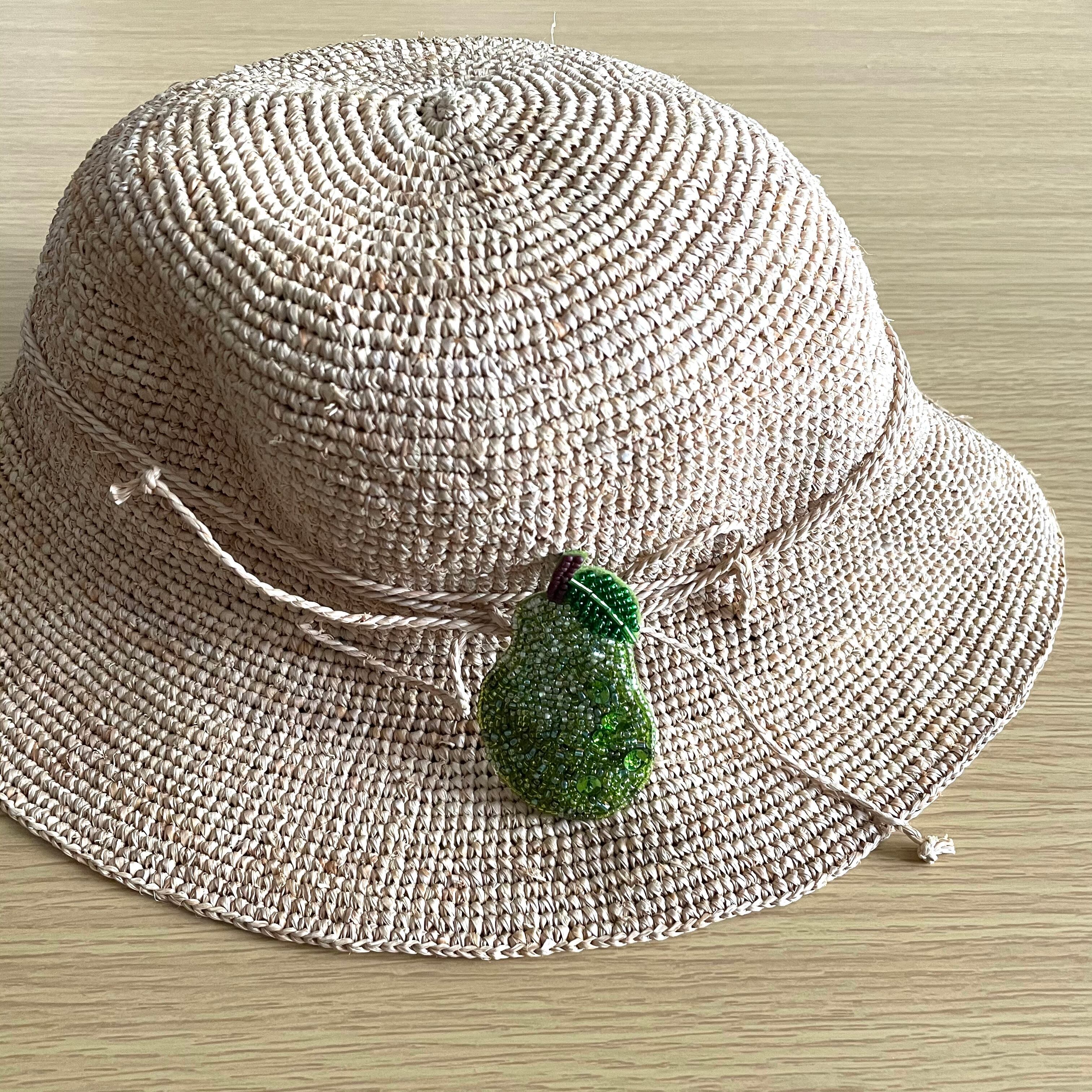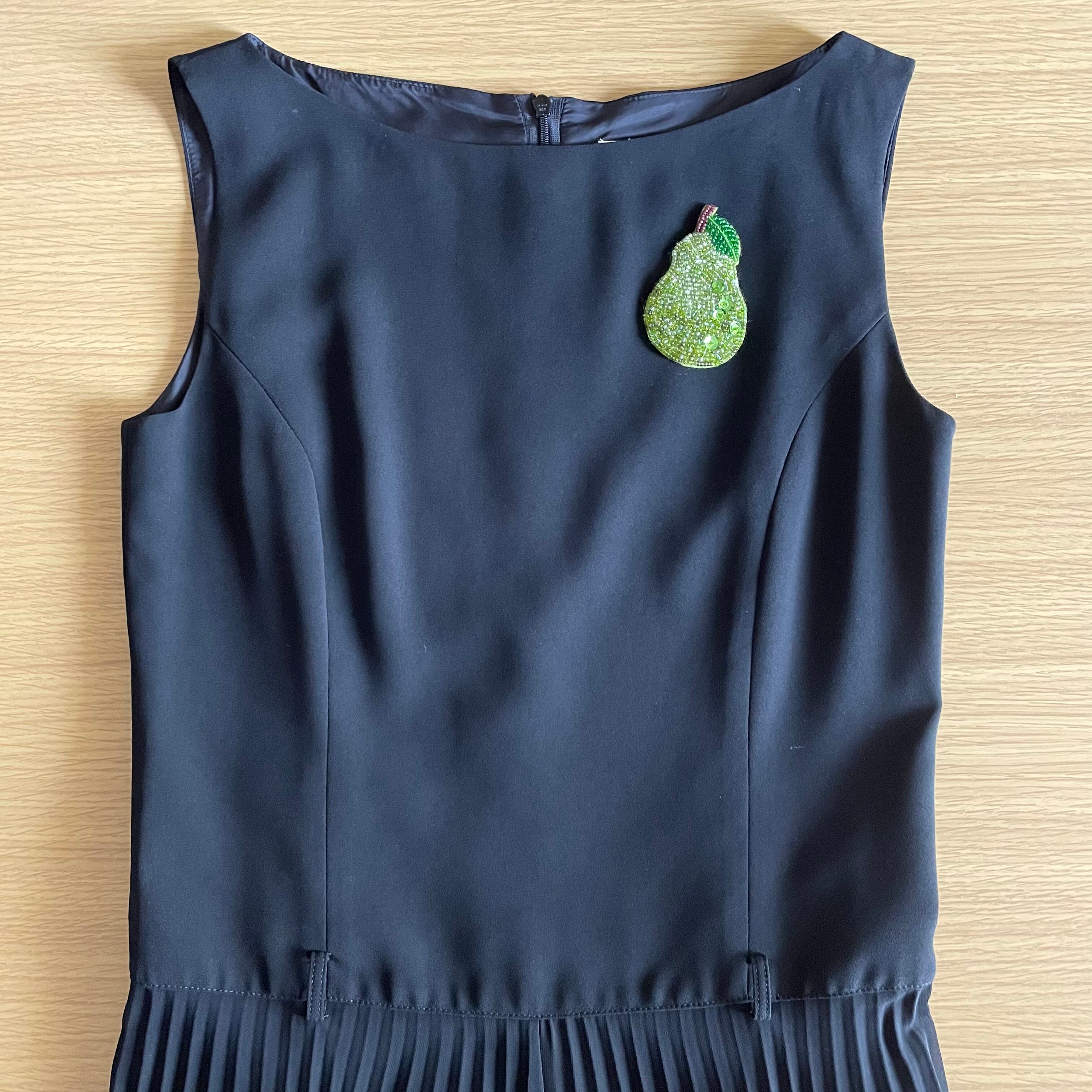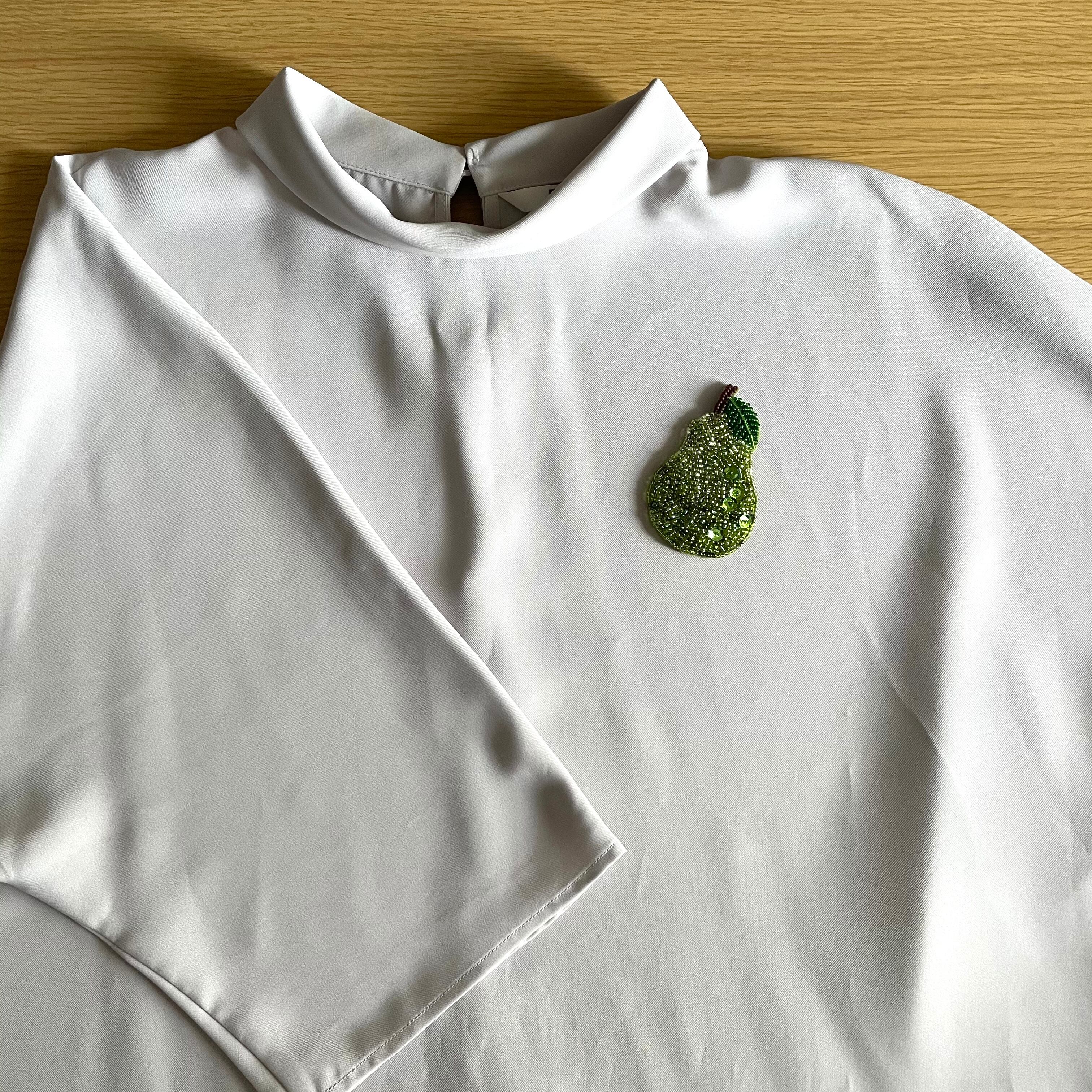 さまざまなグリーンのグラデーションのビーズ刺繍で、洋梨のみずみずしさを表現したブローチです