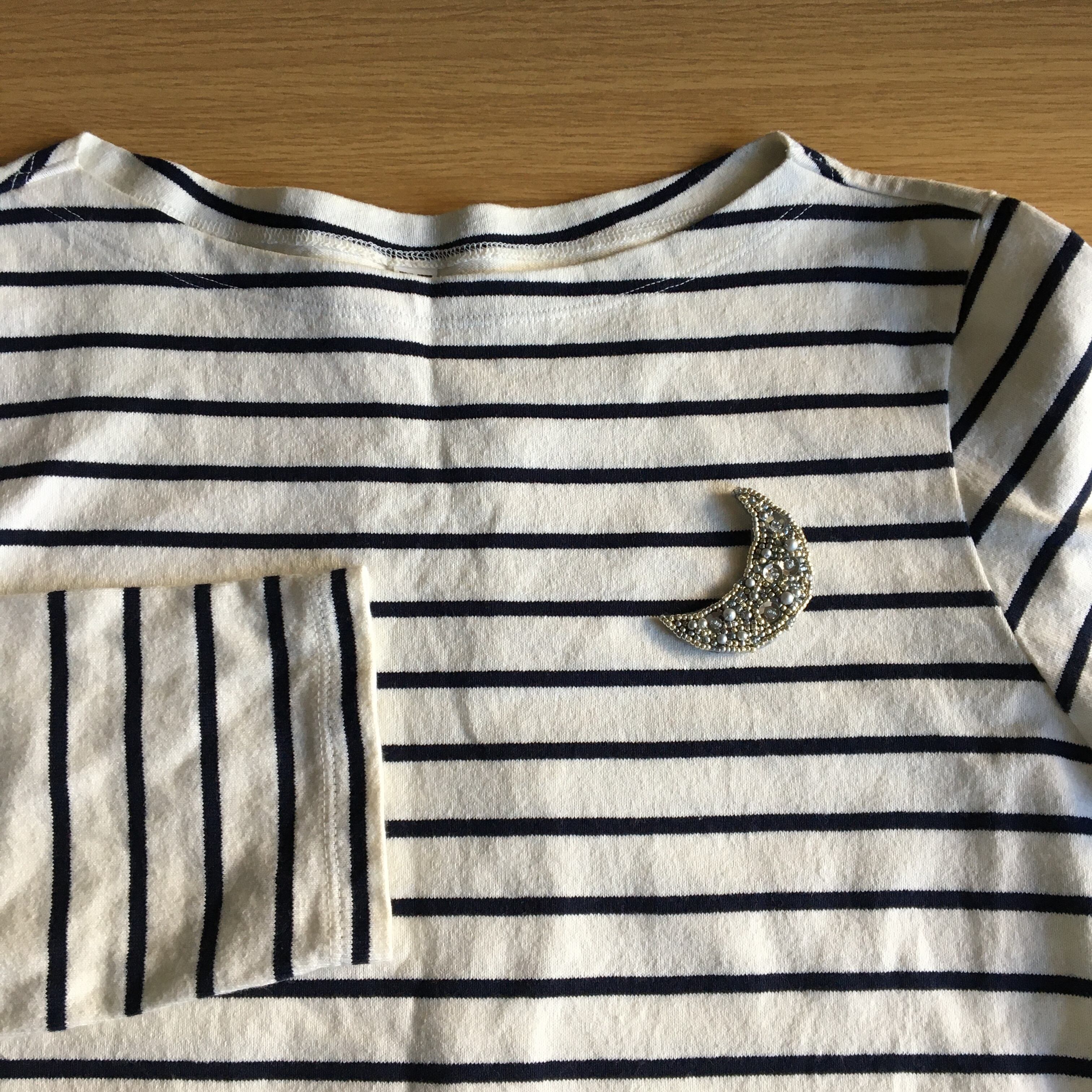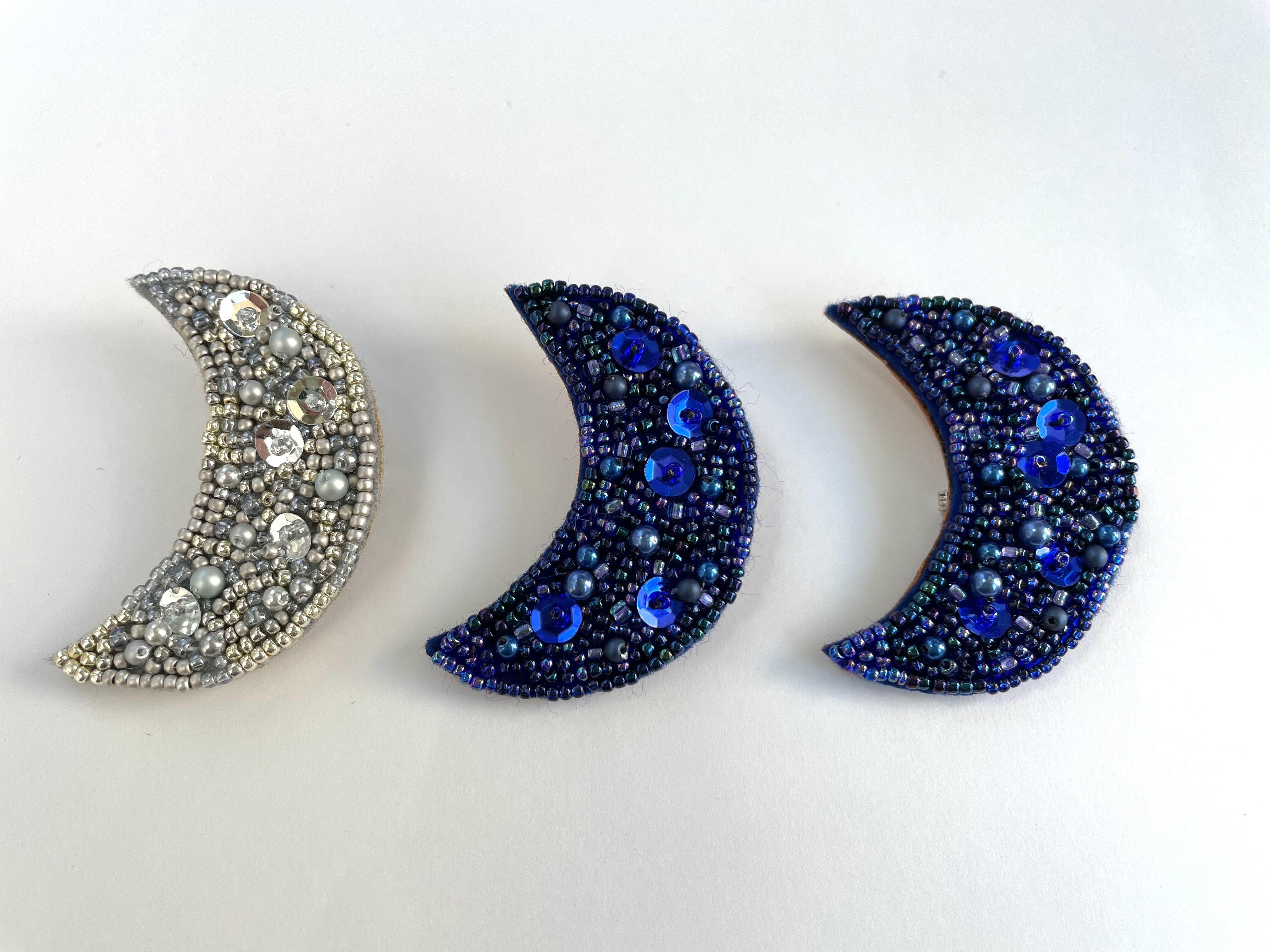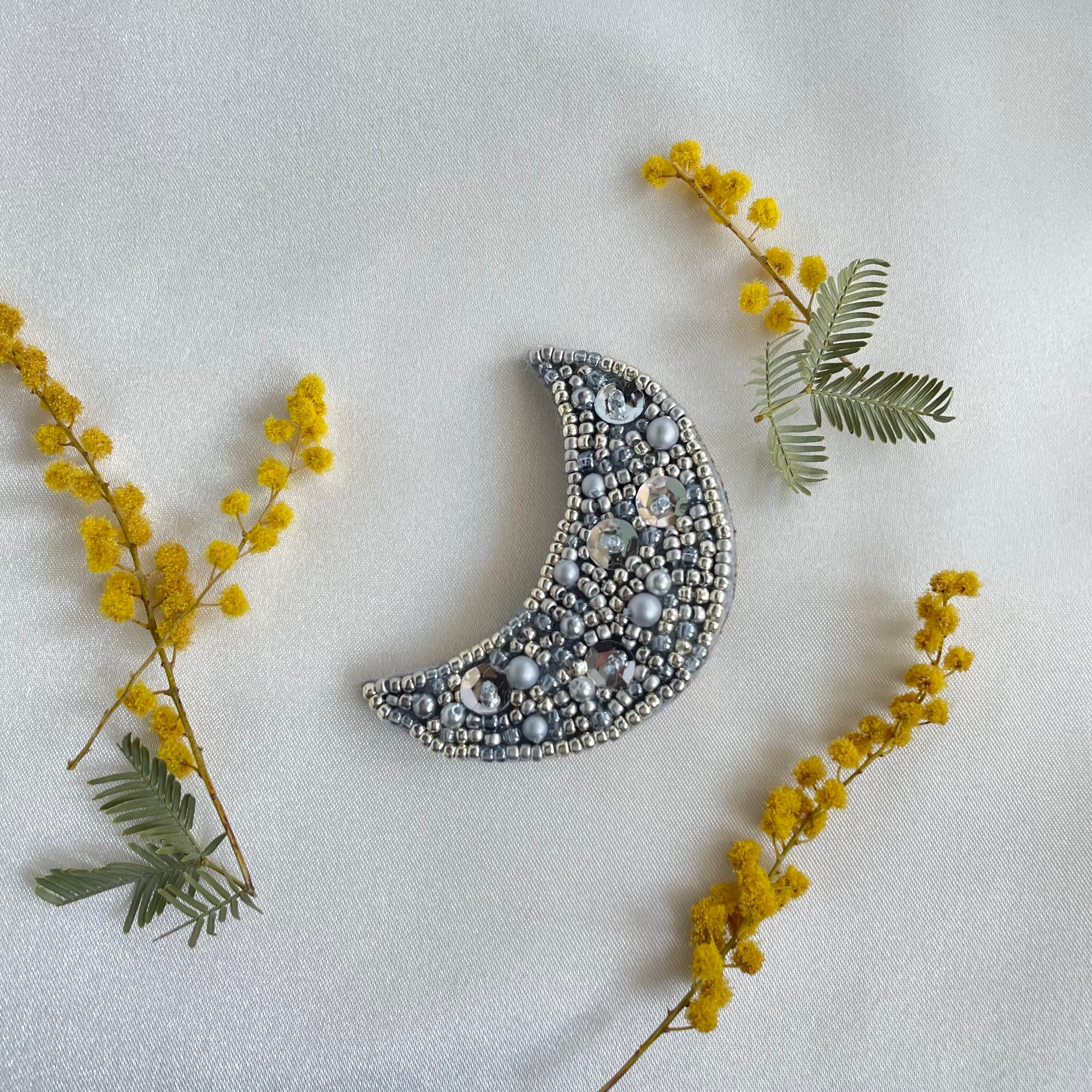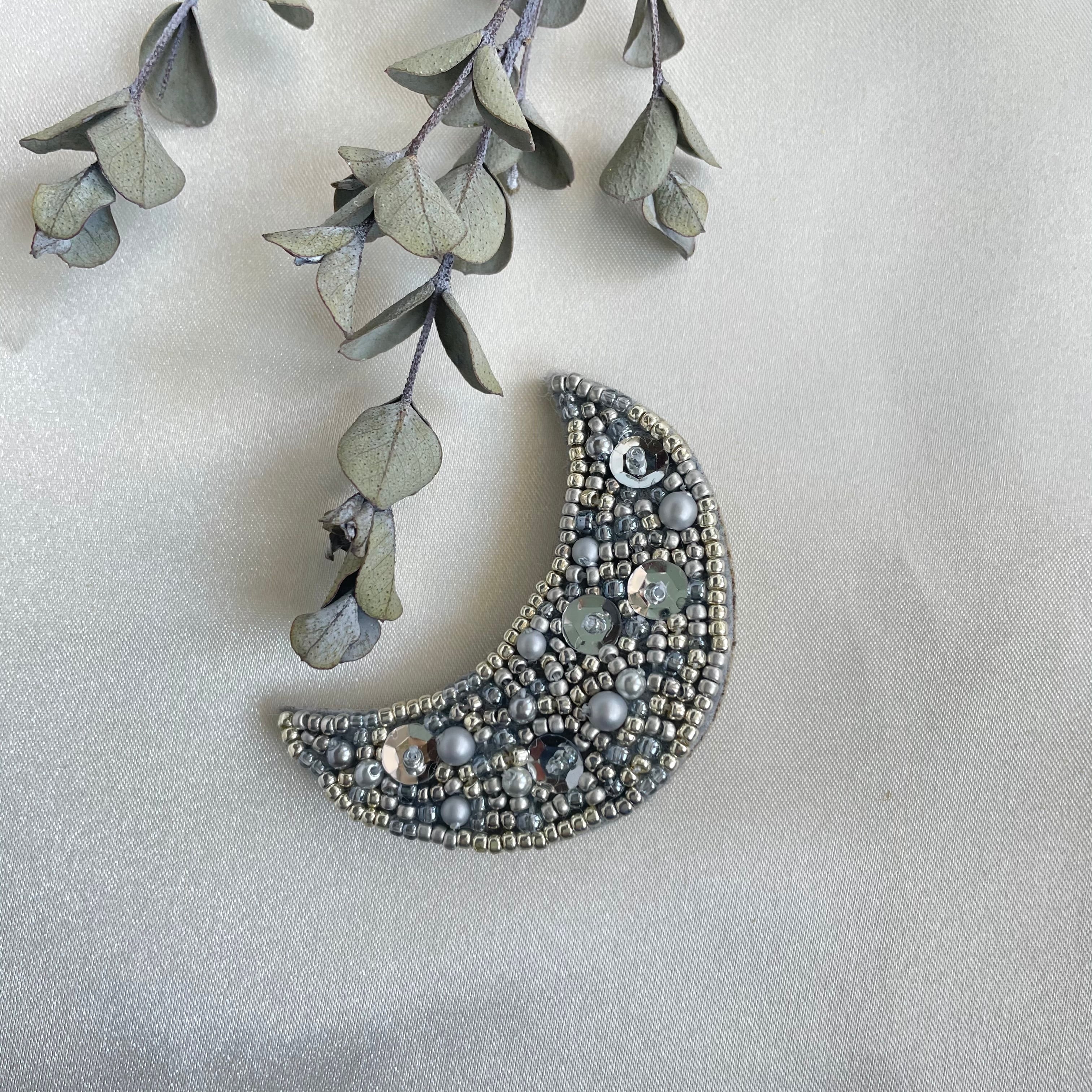 銀色の月が胸元でキラキラと輝く、月の形のブローチです