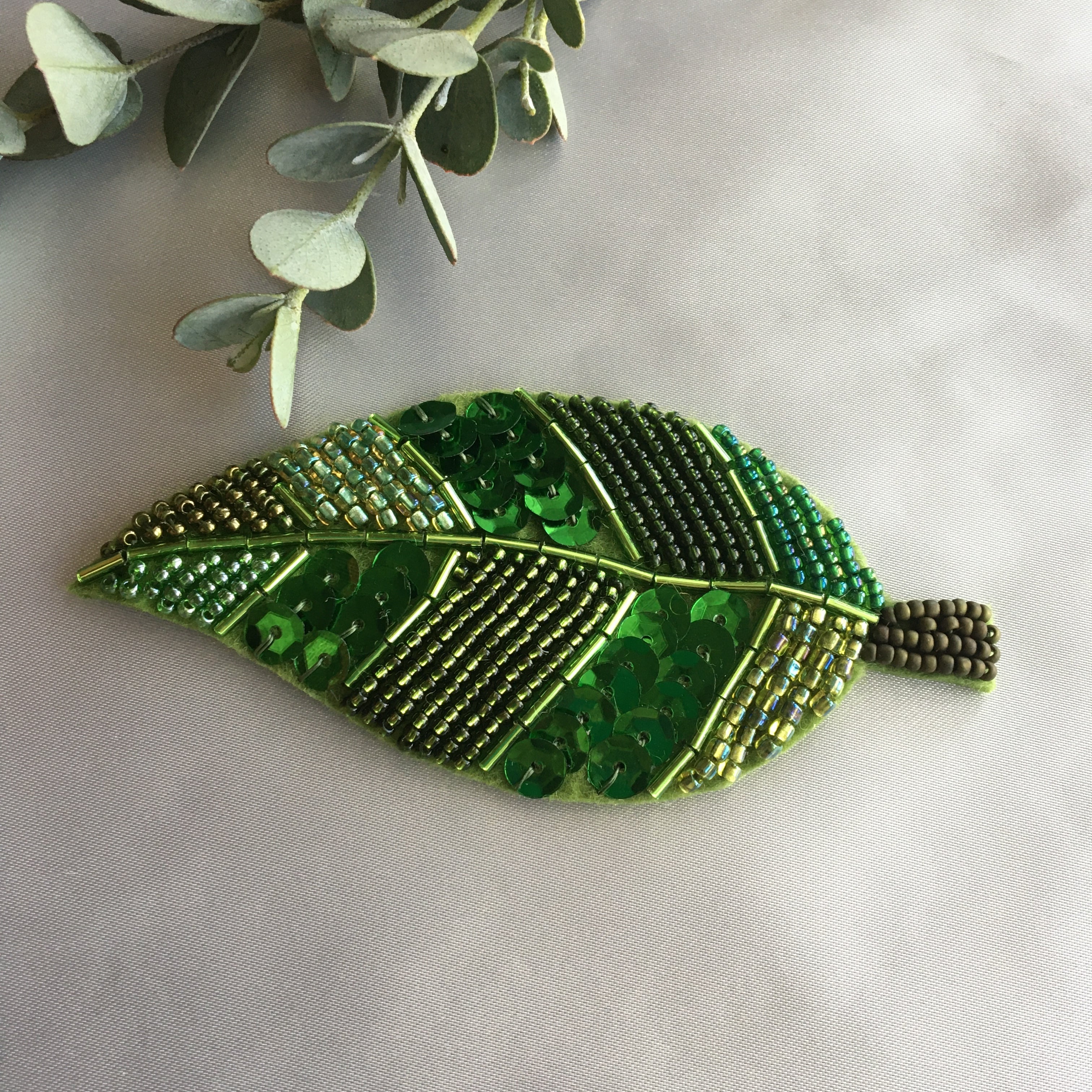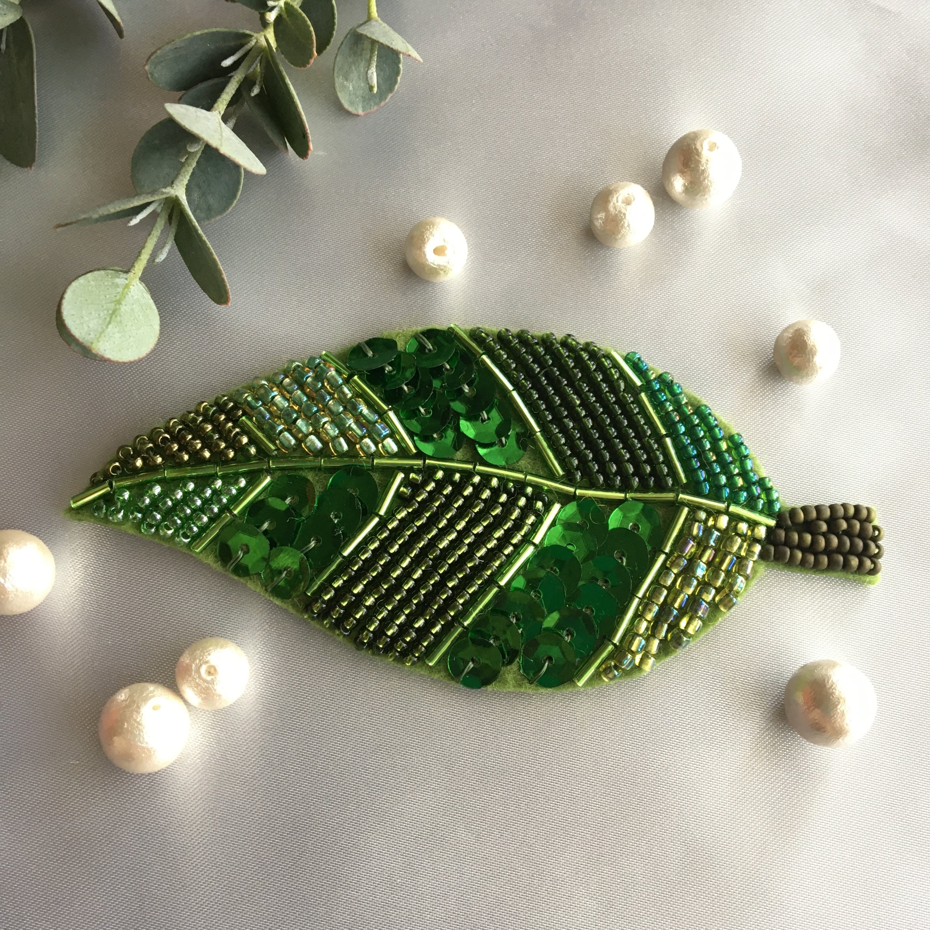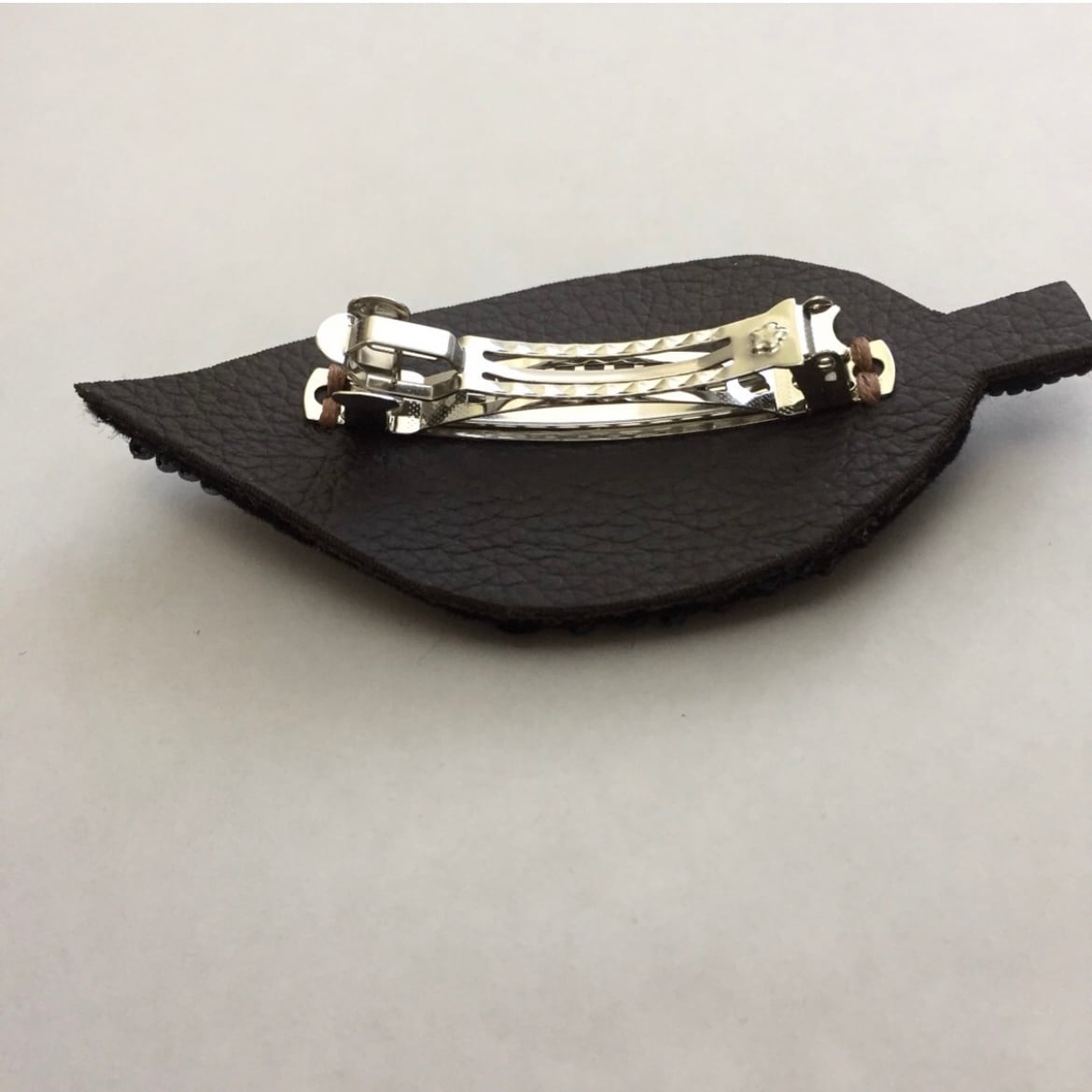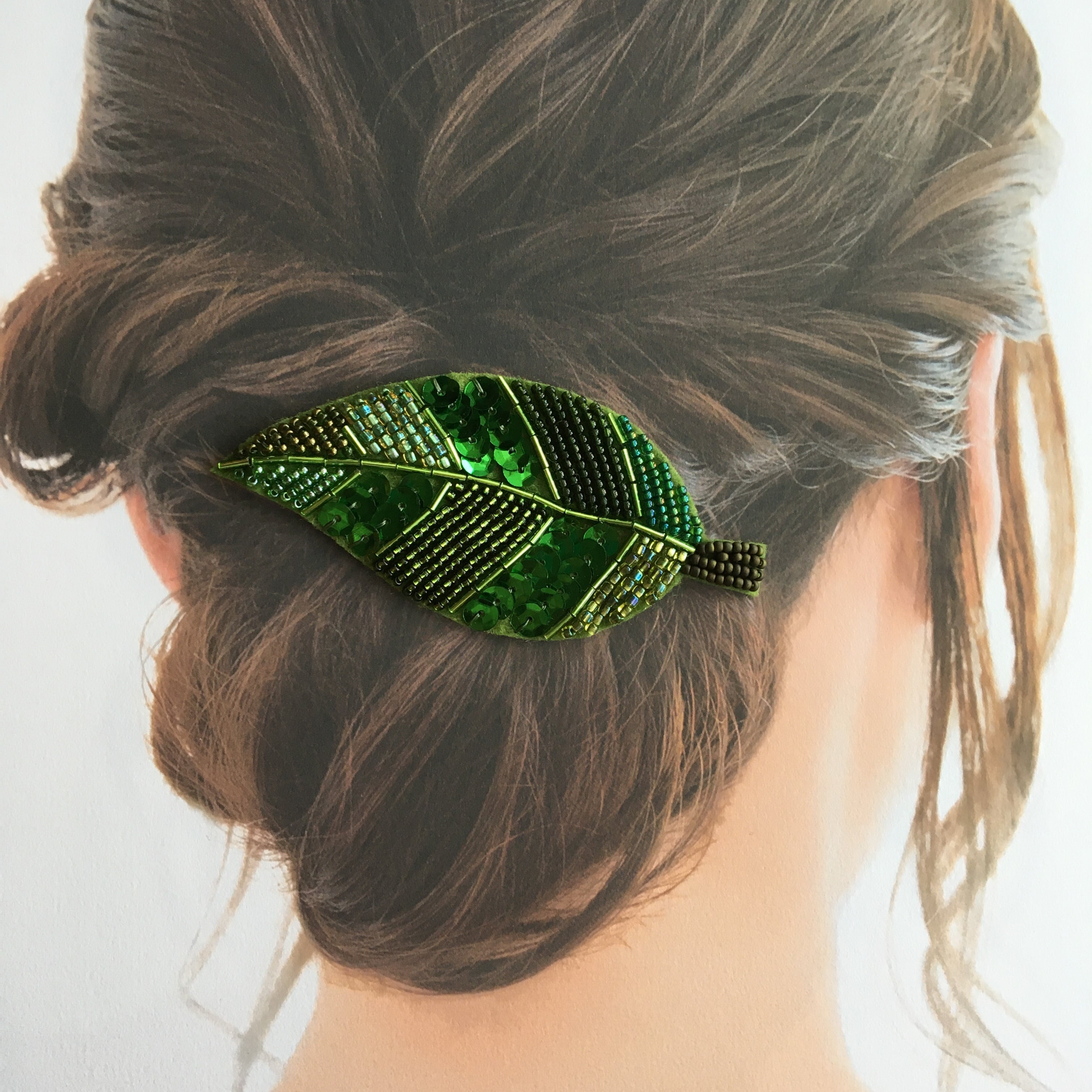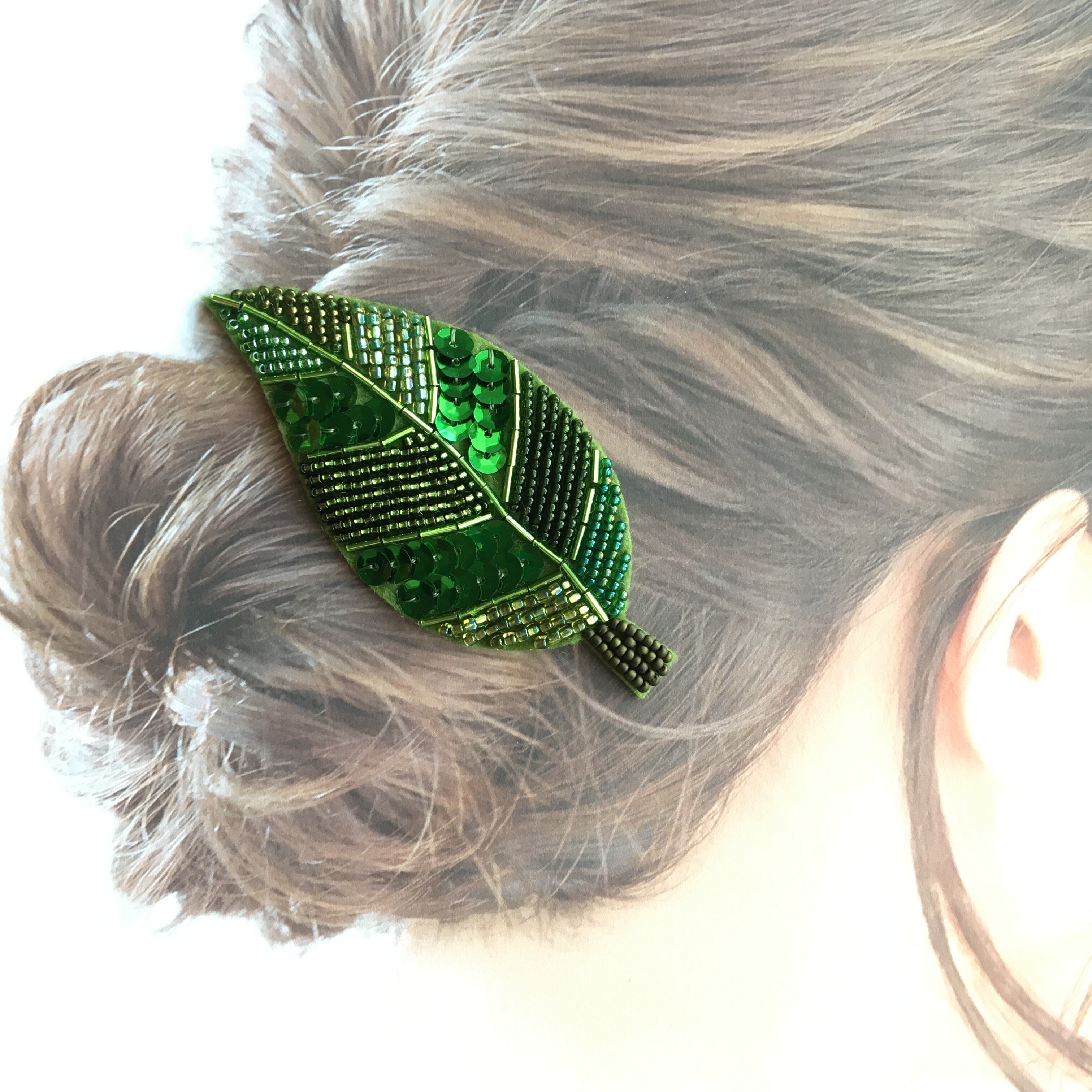 スパンコールやガラスビーズなど、いろいろな種類のビーズを丁寧に刺繍した、葉っぱのバレッタです