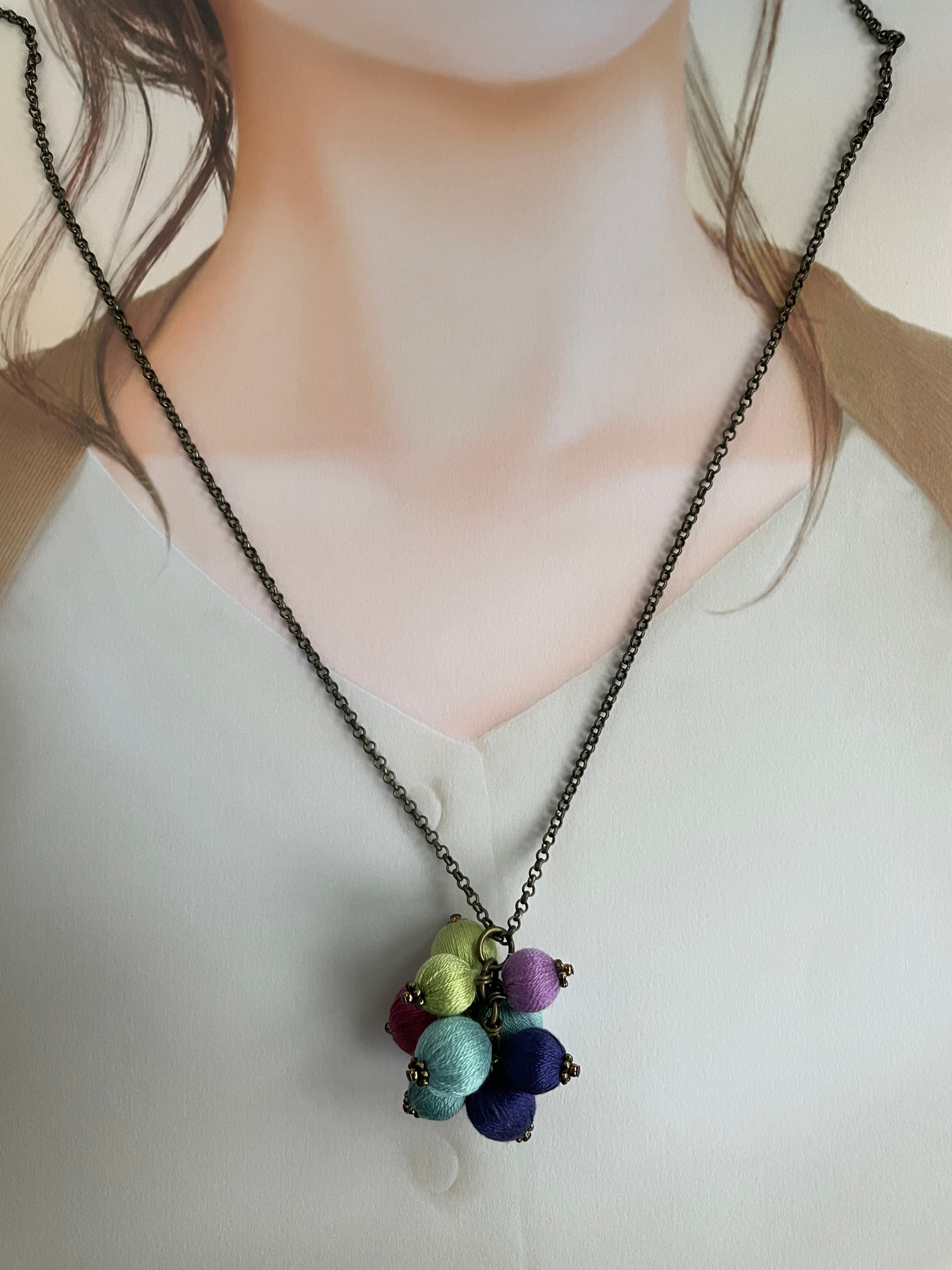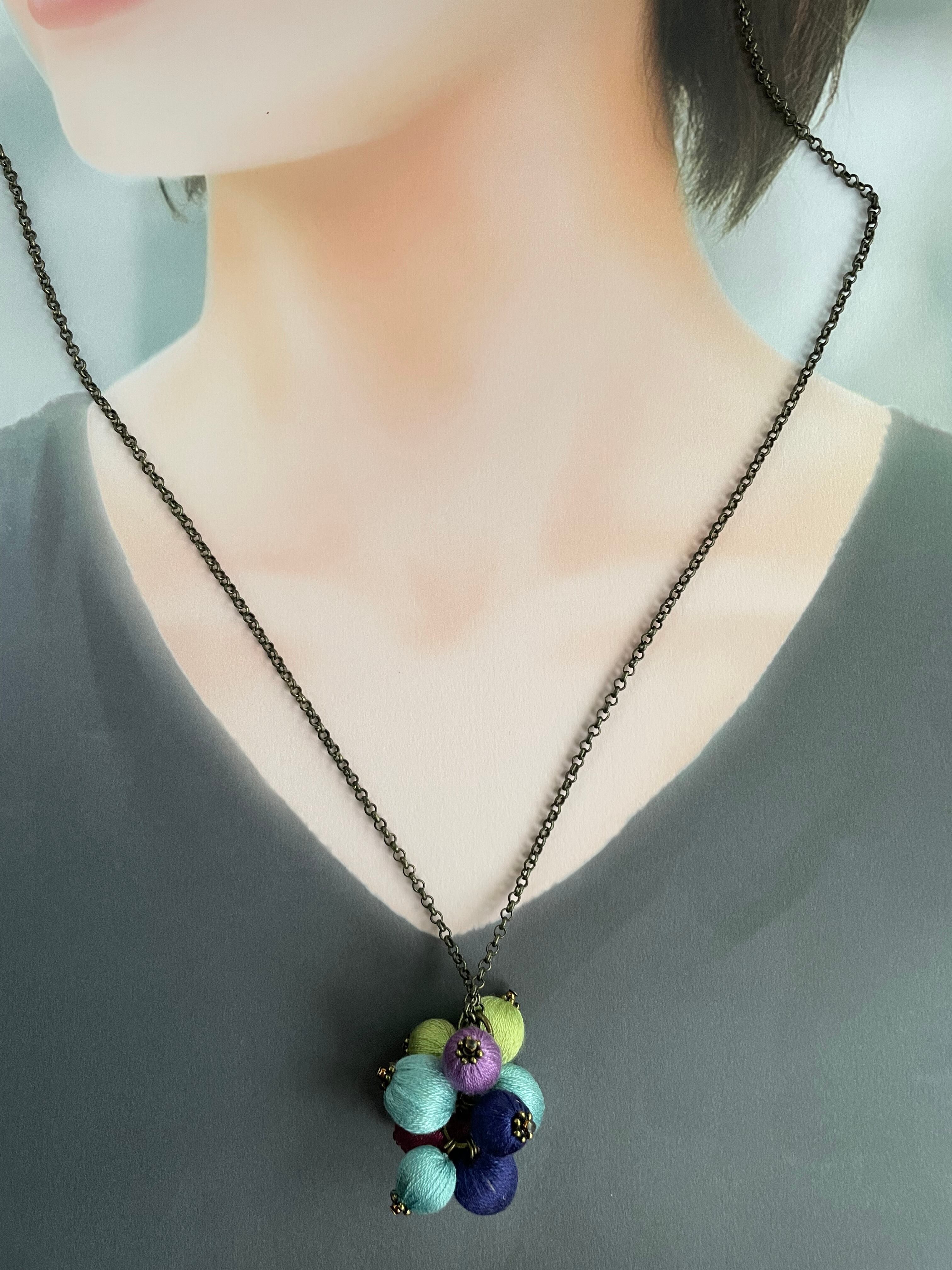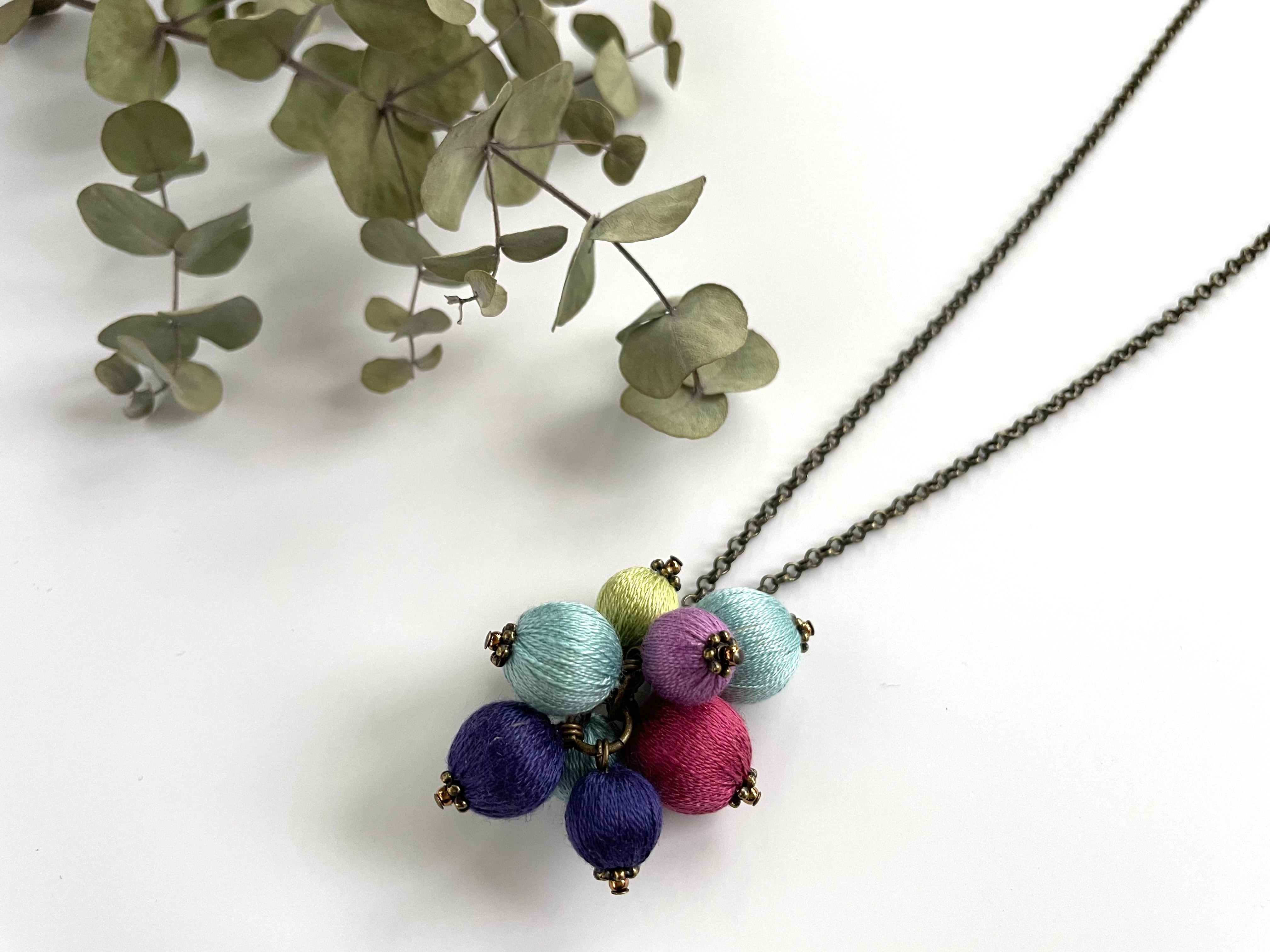 カラフルですが、ウッドビーズに刺繍糸を巻いて作った巻き玉で製作していますので、上品な雰囲気です