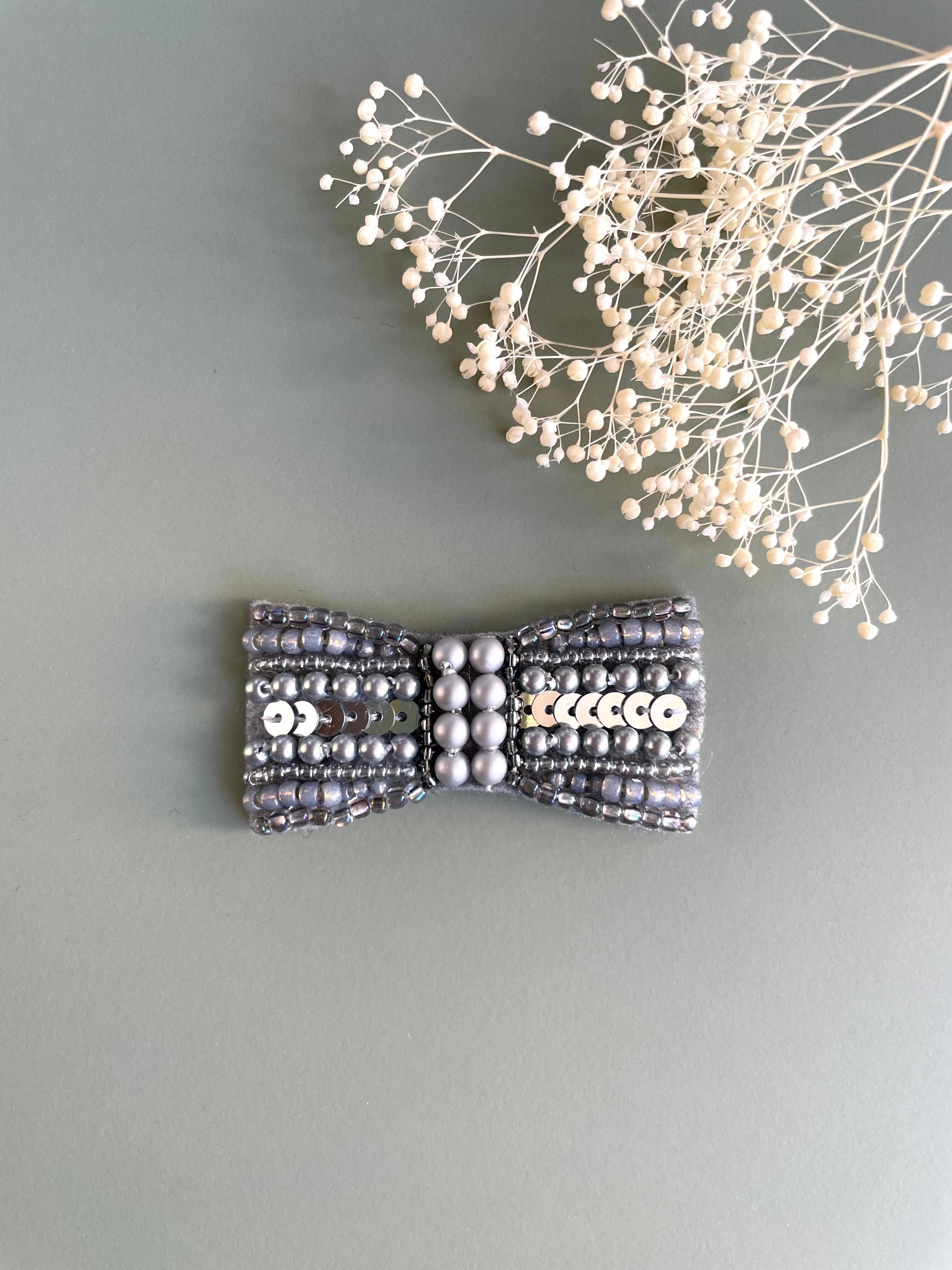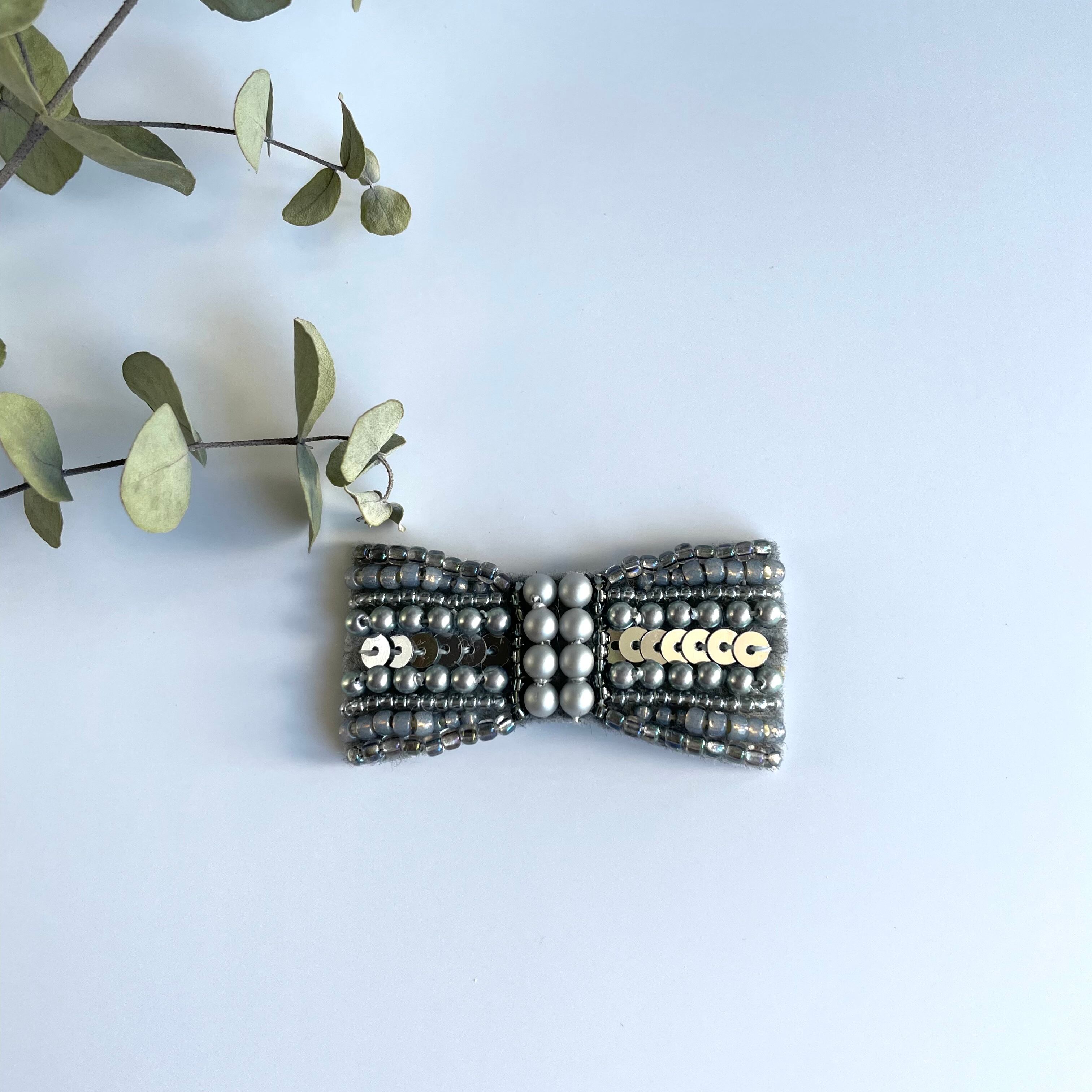 小さなリボンのビーズ刺繍ブローチ*グレー