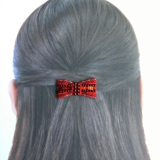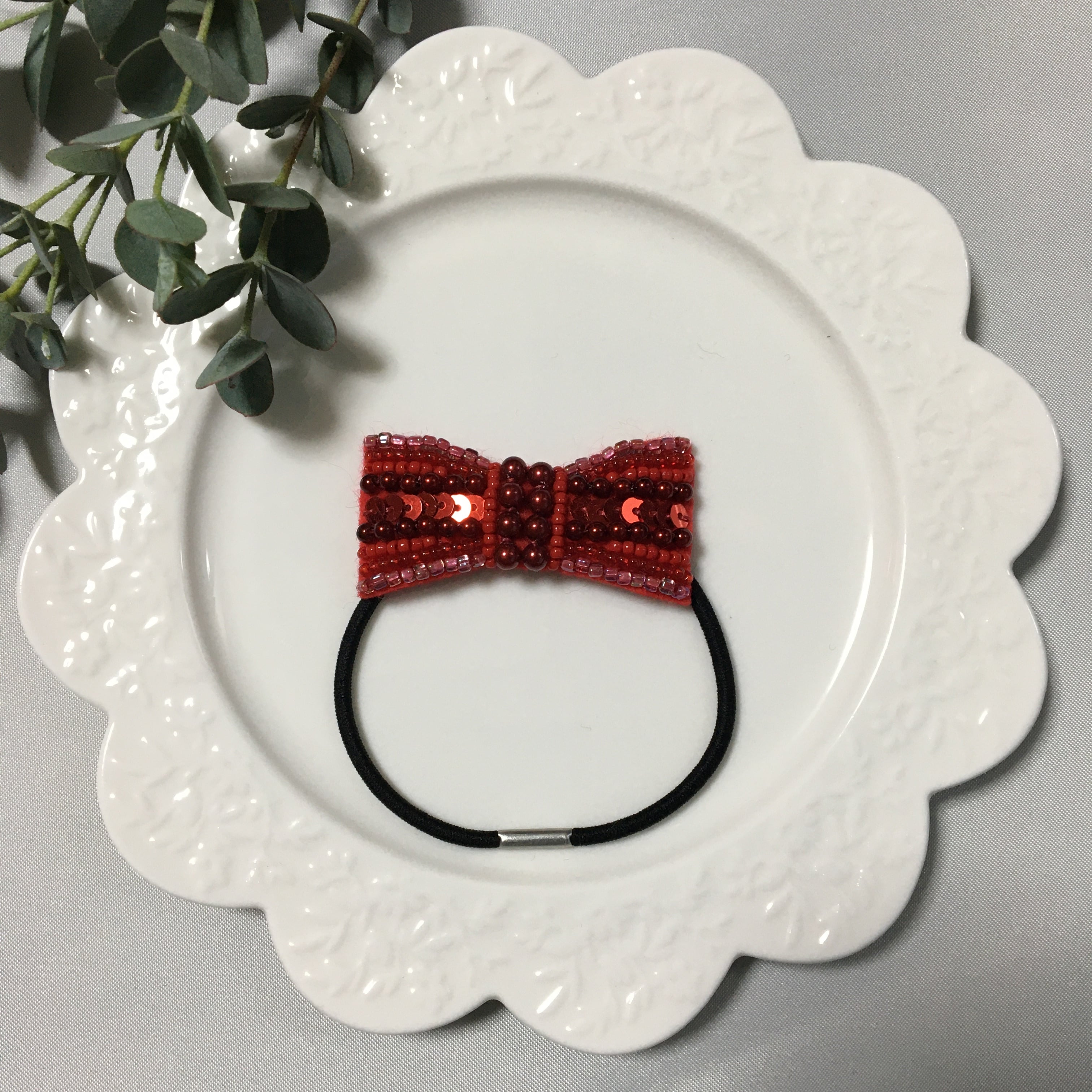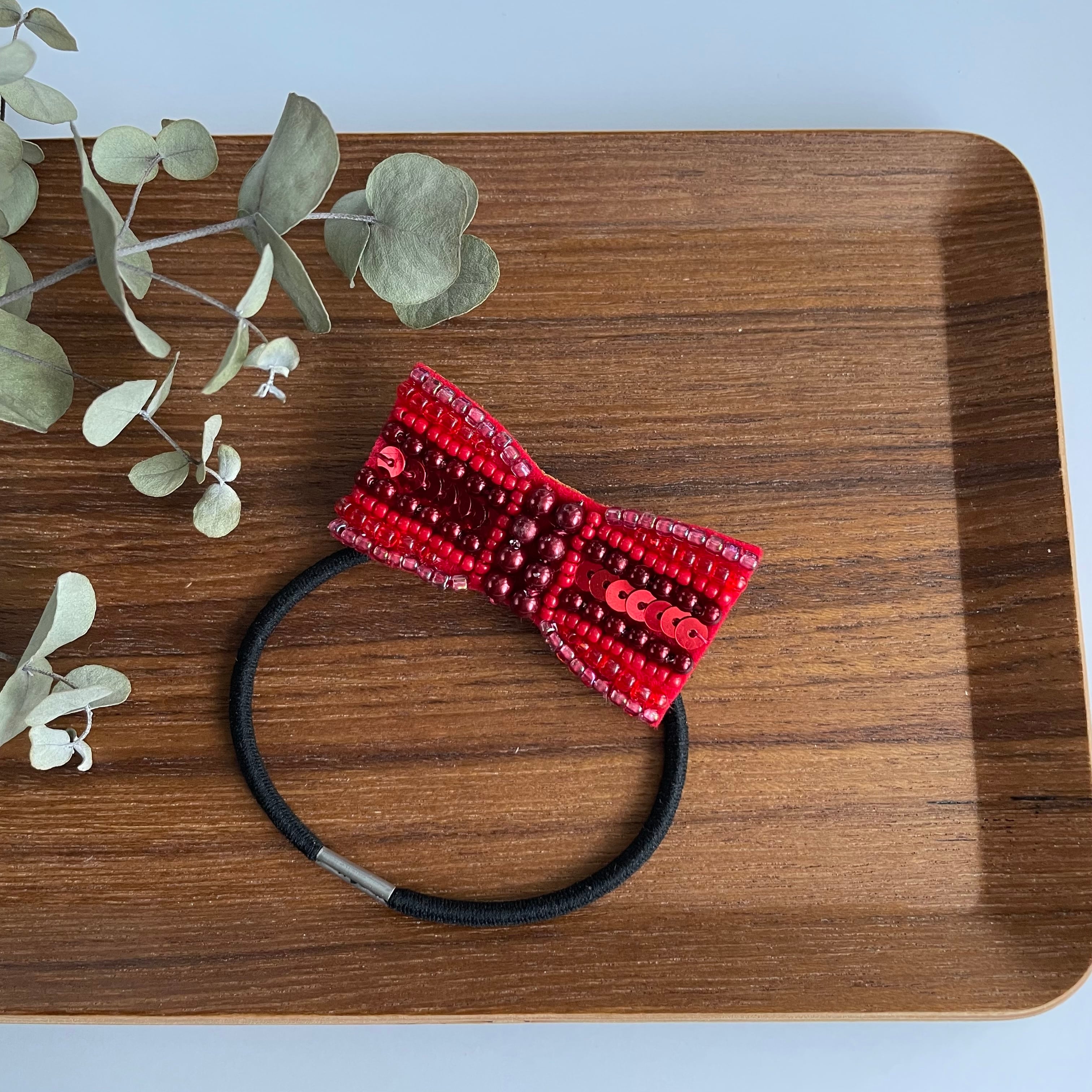 小さなリボンのビーズ刺繍ヘアゴム*赤