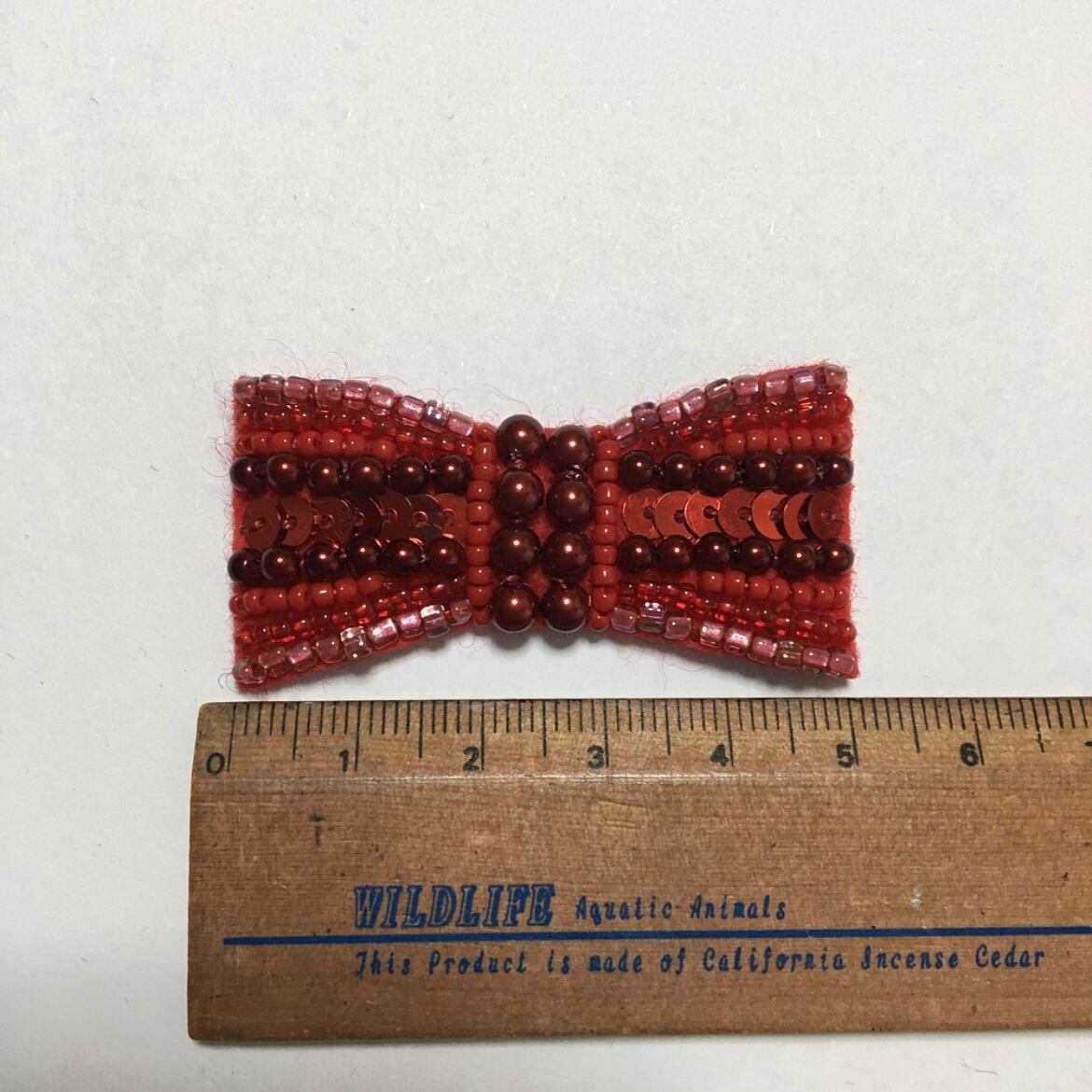 様々な種類の赤いガラスビーズやスパンコールなどを、一粒一粒丁寧に刺繍しています