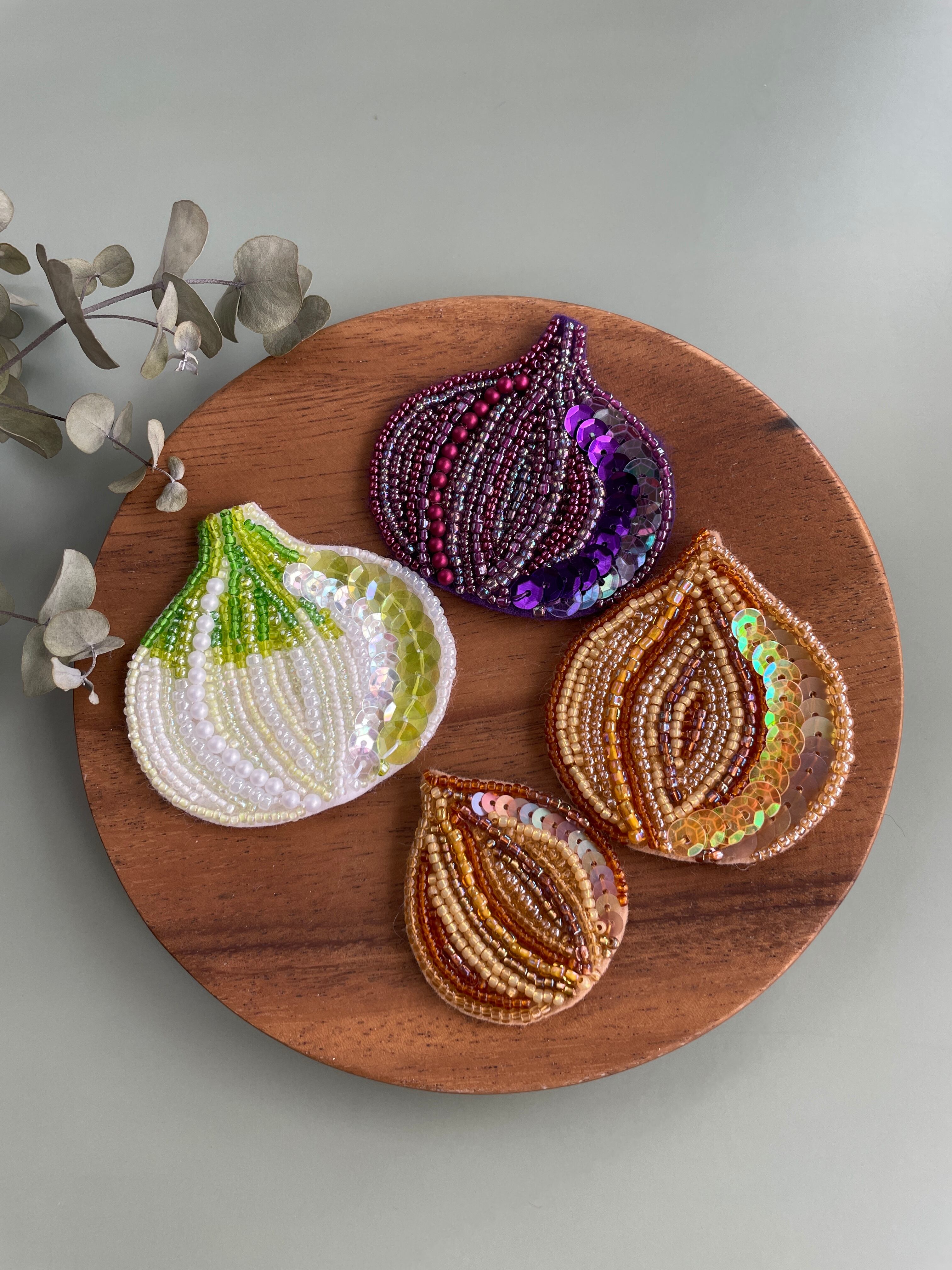 みずみずしい新玉ねぎをビーズ刺繍で表現してみました