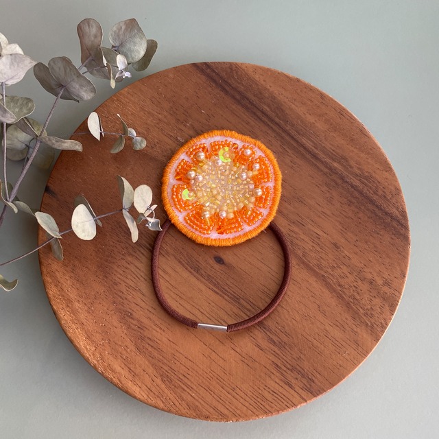 オレンジのビーズ刺繍ヘアゴム