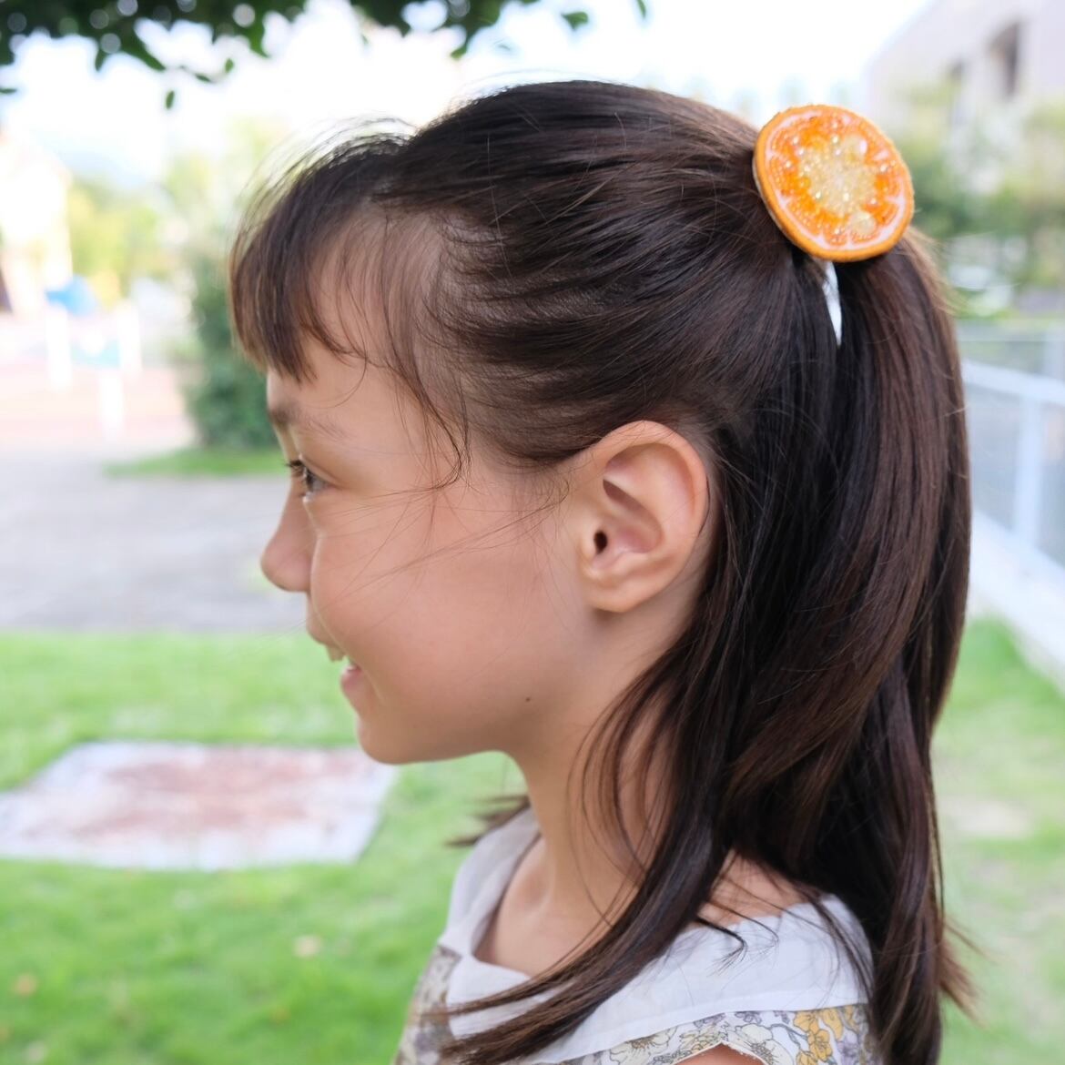大人の着画は同じ大きさのレモンスライスのヘアゴムです