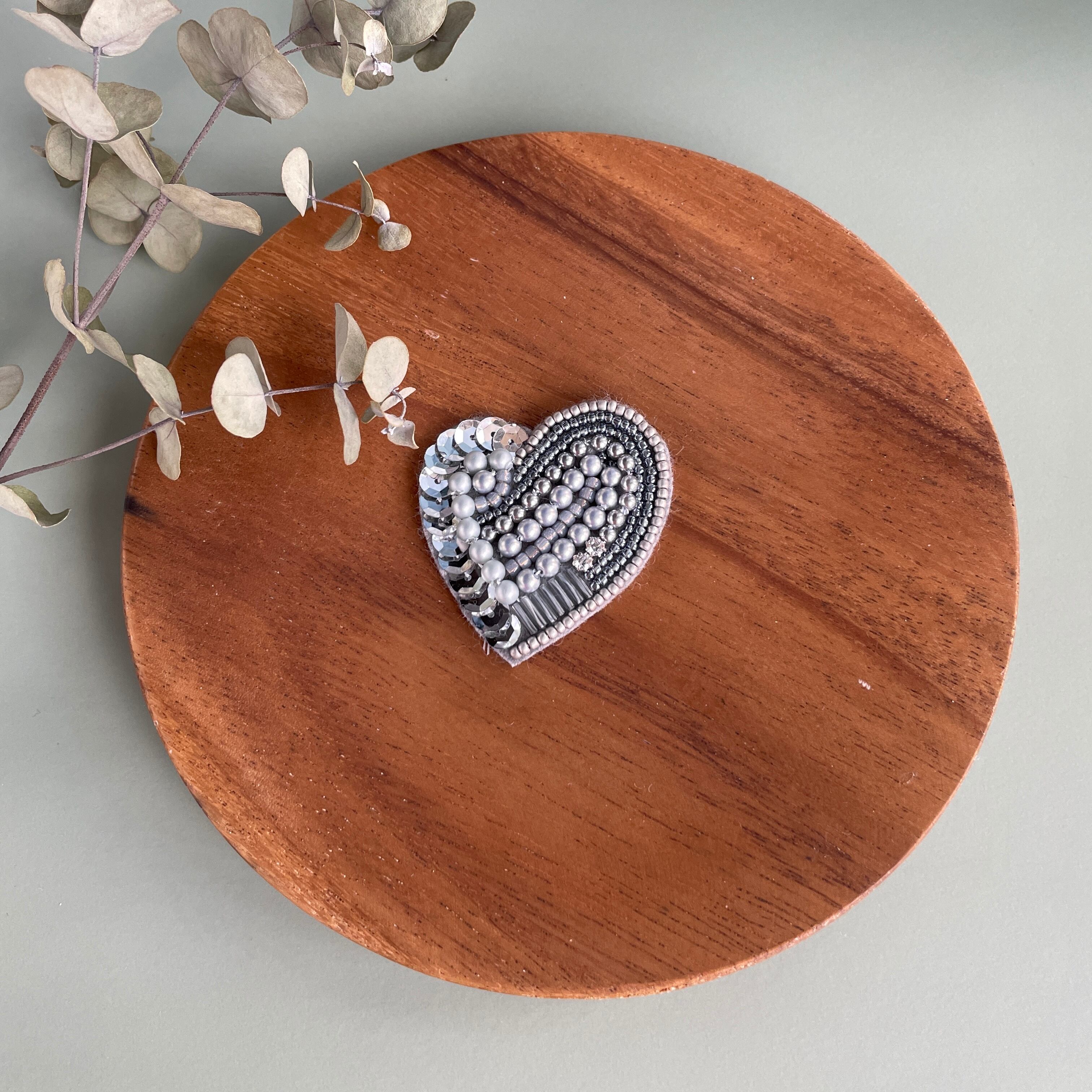 ハートのビーズ刺繍ブローチ*シルバー