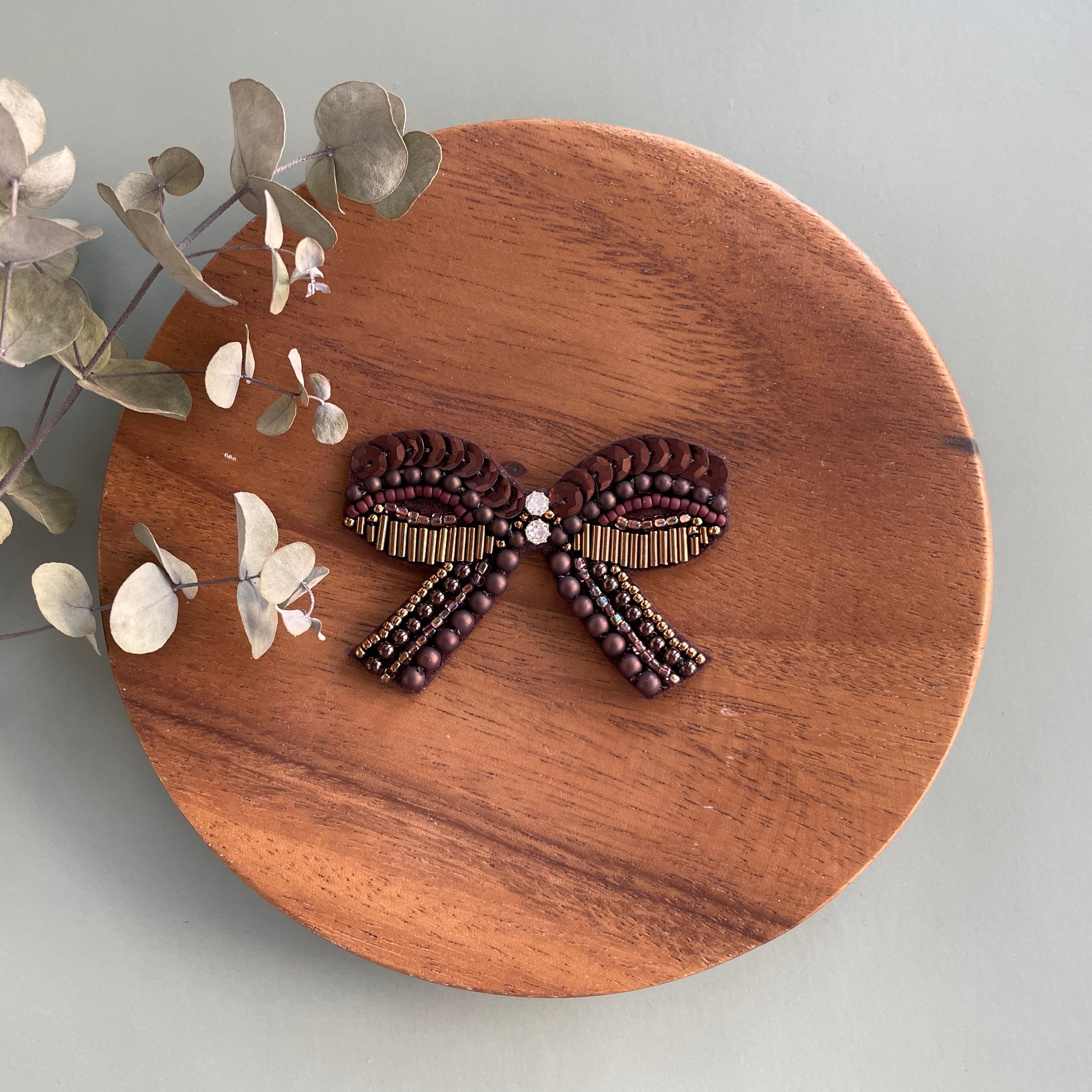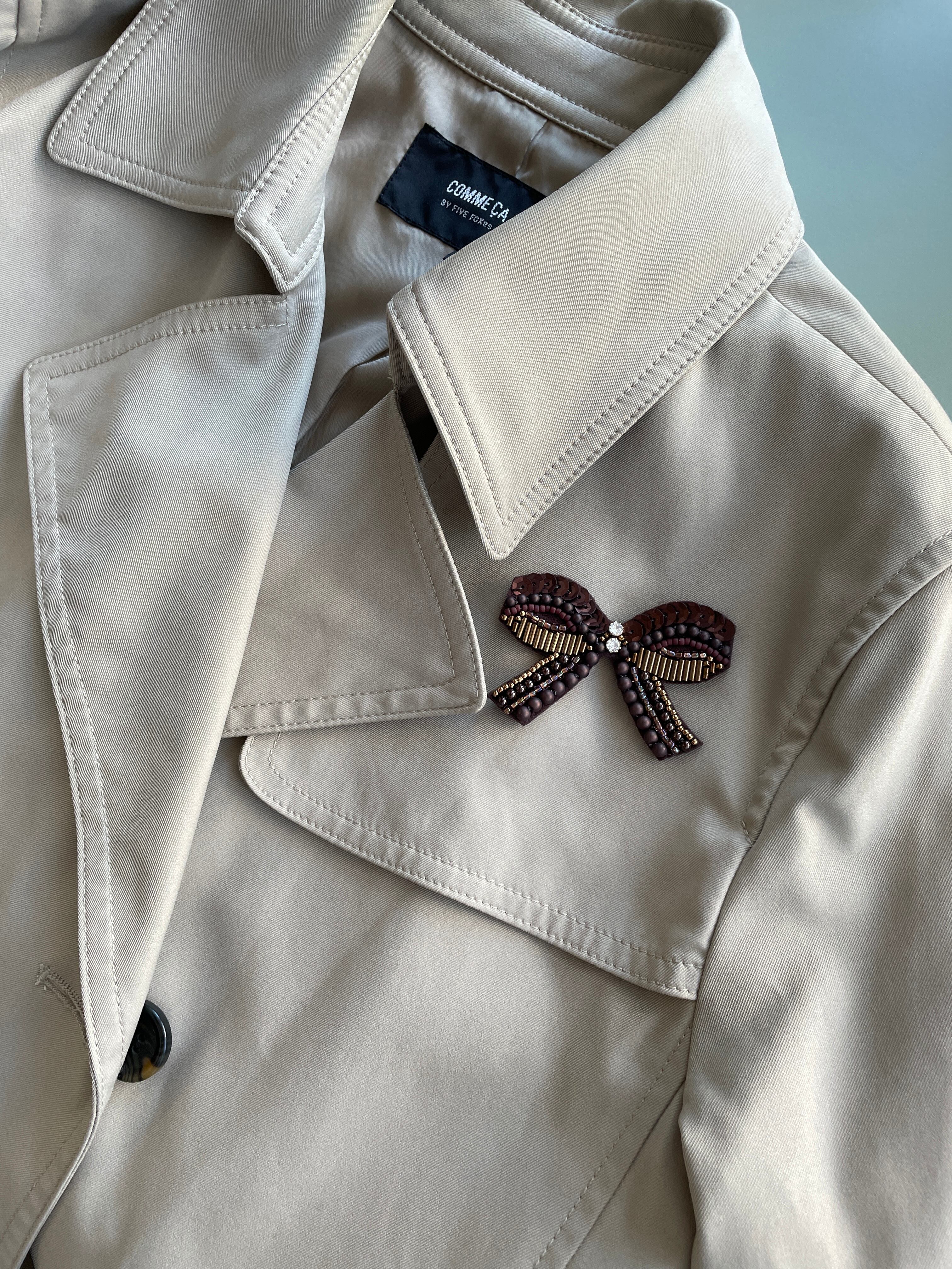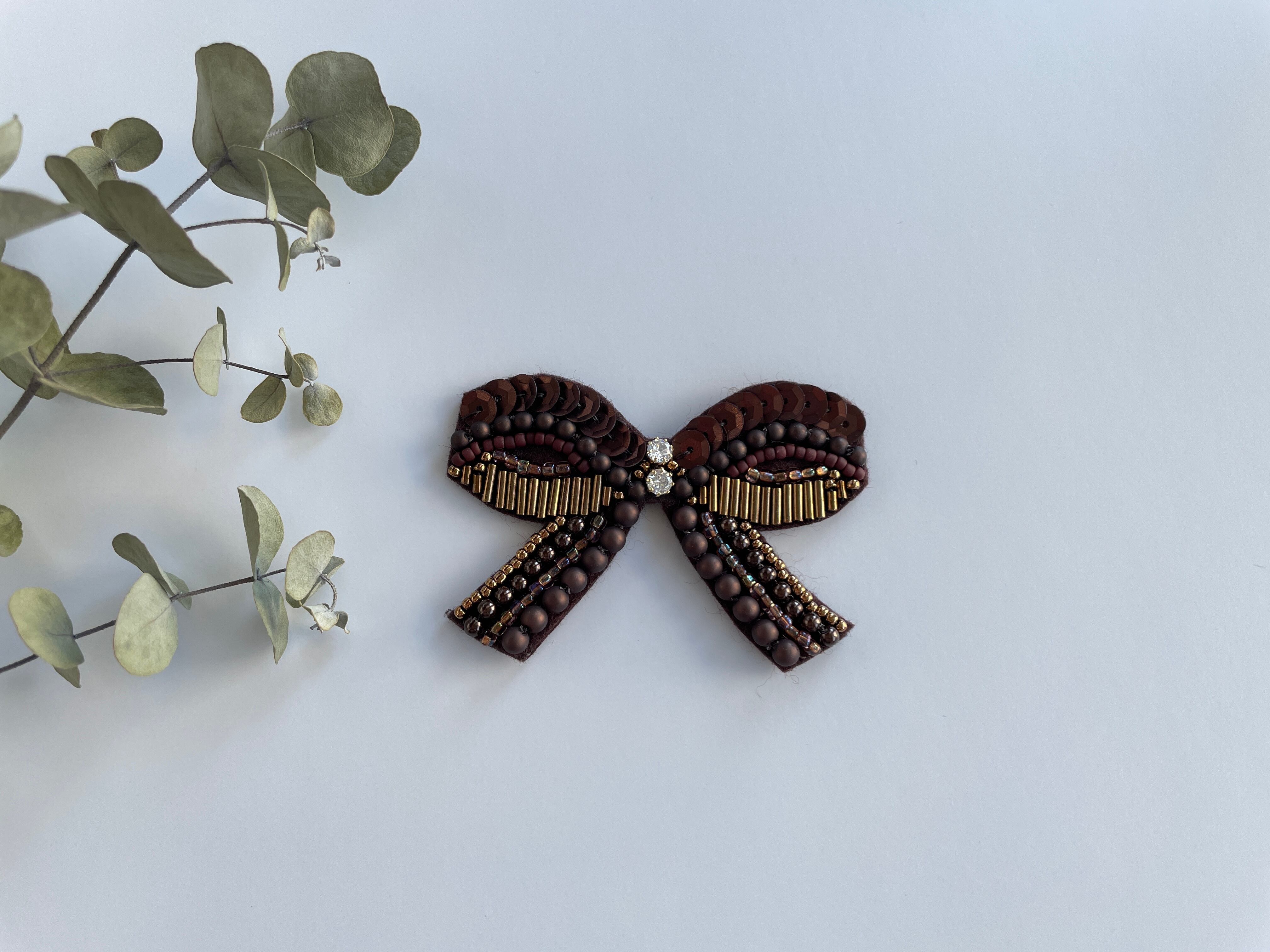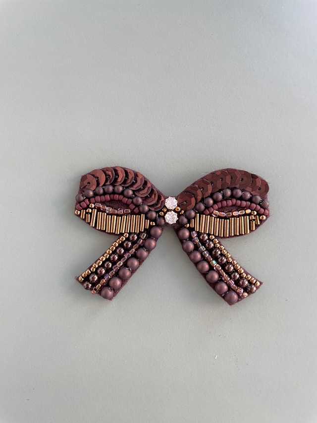こっくりカラーちょうちょ結びのビーズ刺繍ブローチ*ビターチョコ