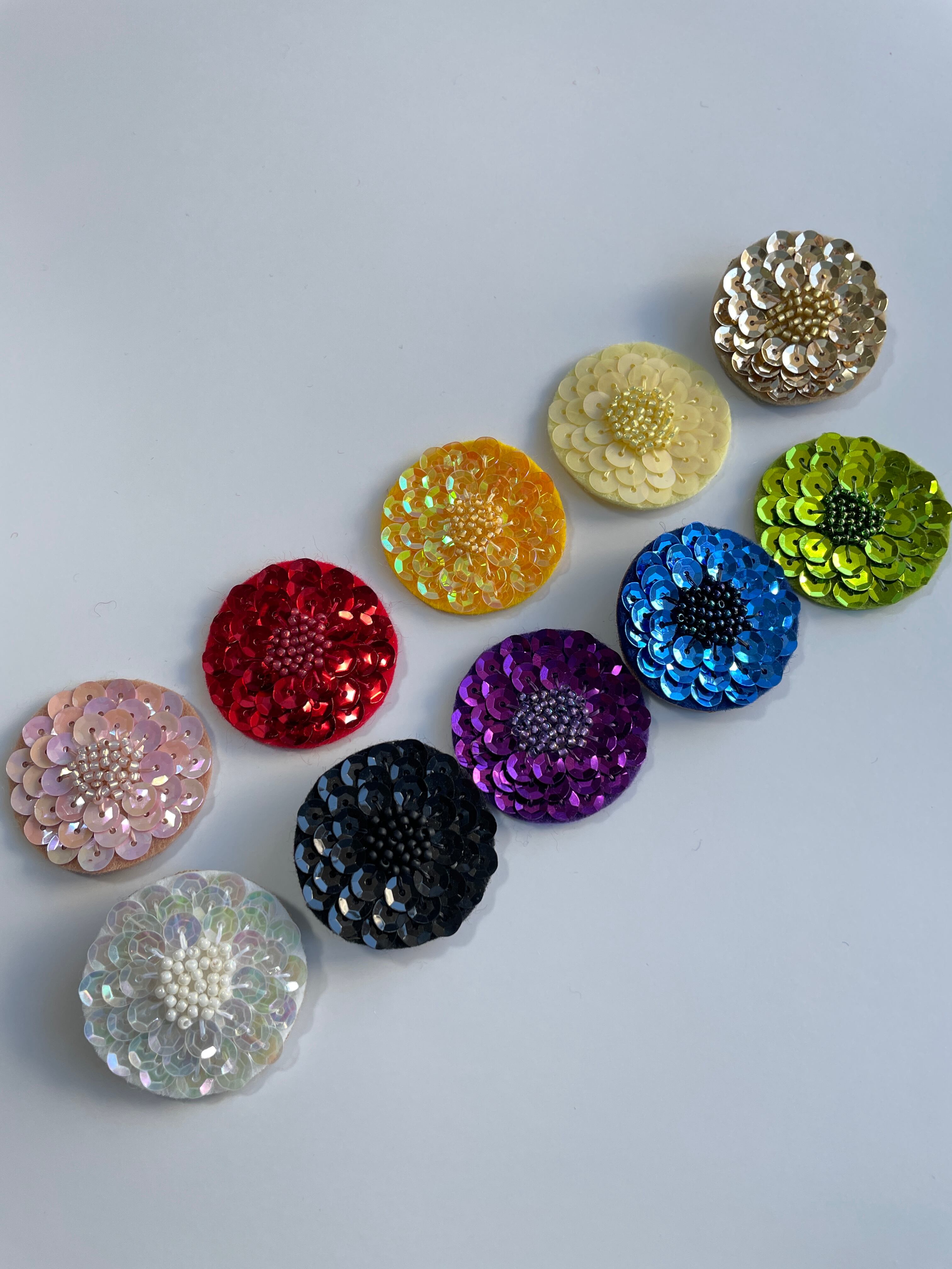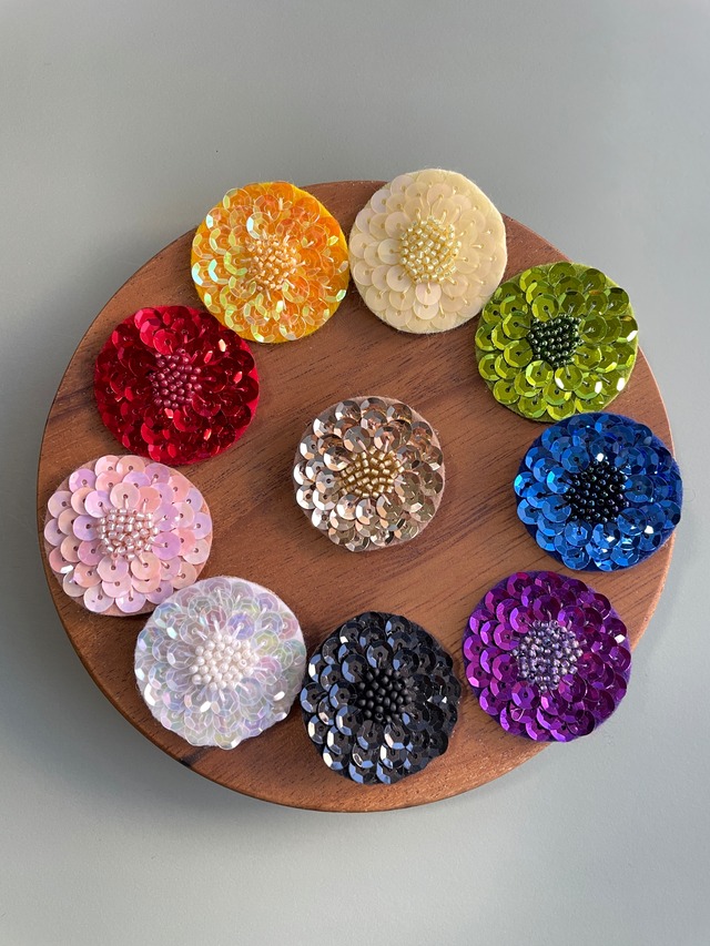 きれいな色のスパンコールとビーズの組み合わせが美しいダリアのブローチを作れるビーズ刺繍キットです