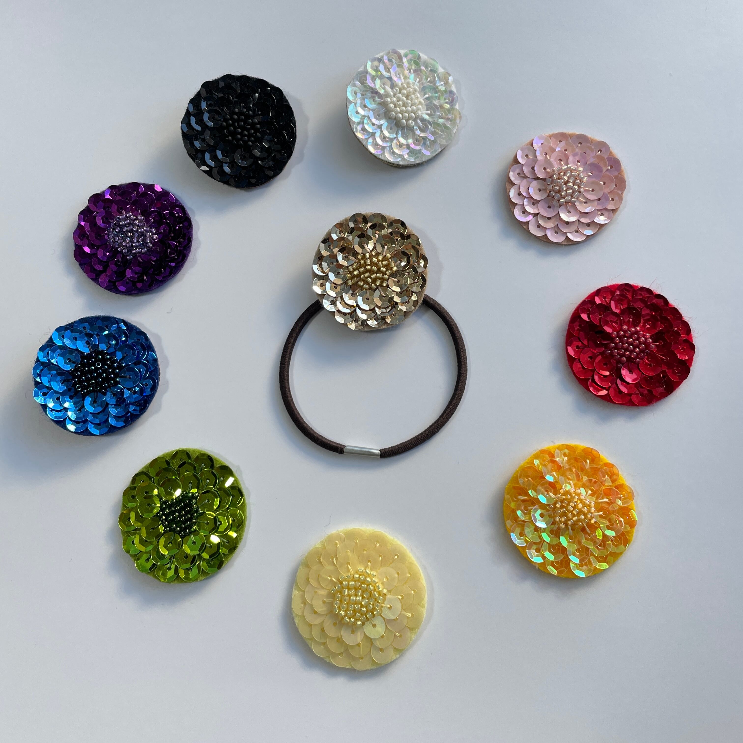 きれいな色のスパンコールとビーズの組み合わせが美しいダリアのヘアゴムを作れるビーズ刺繍キットです