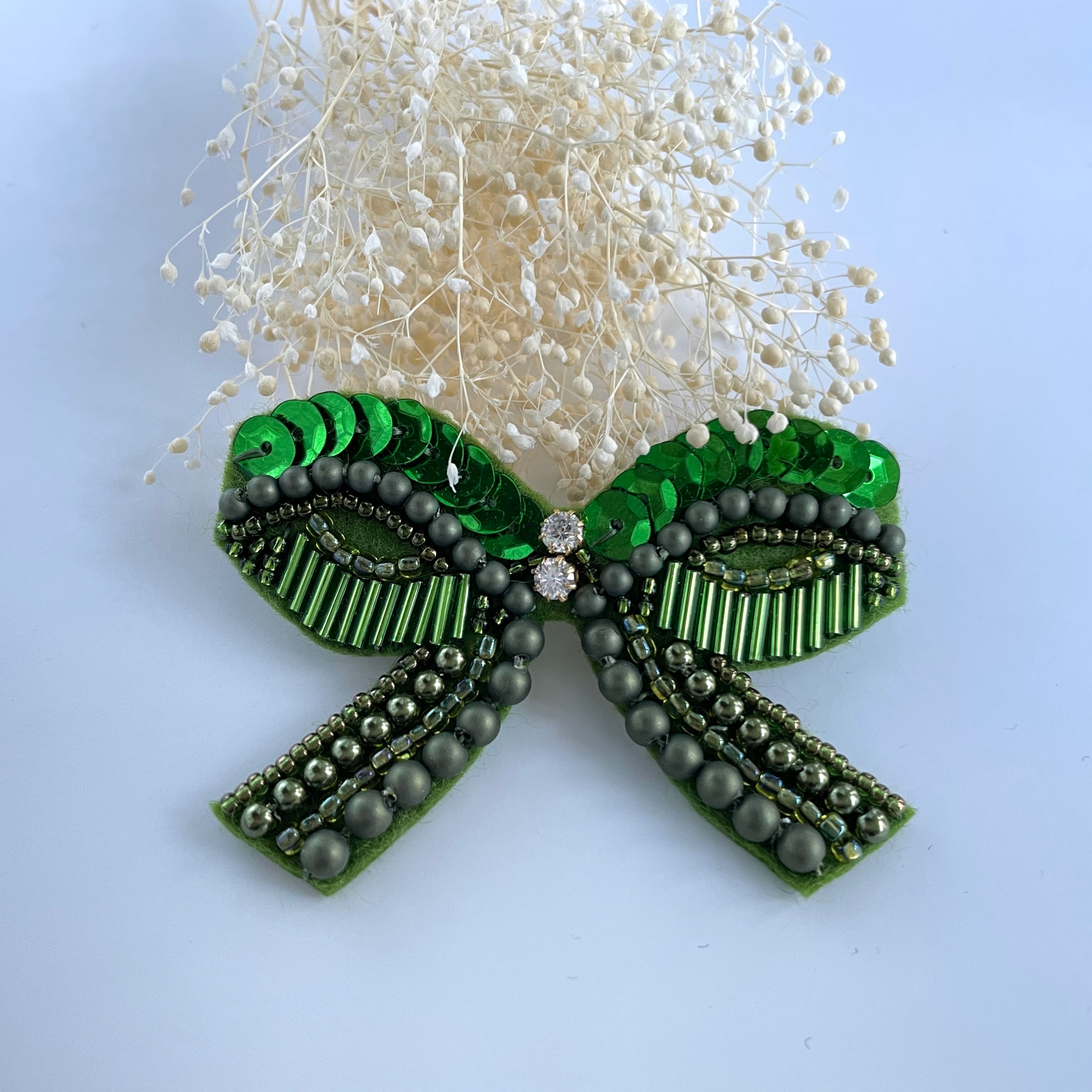 鮮やかグリーン*ちょうちょ結びのビーズ刺繍ブローチ