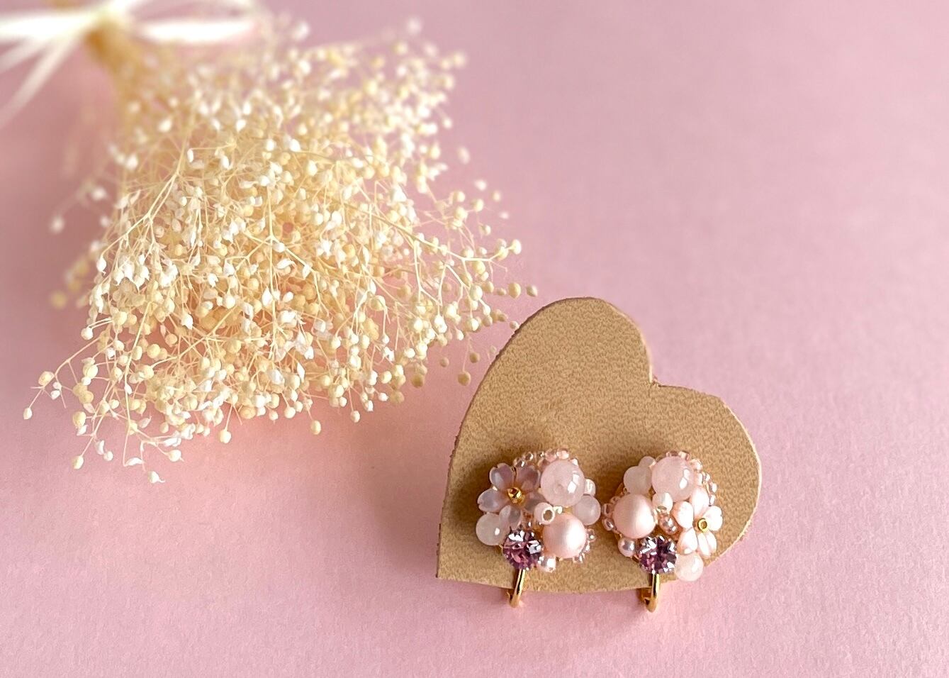 桜の形の貝やローズクォーツなど天然石やさまざまなビーズのグラデーションが美しいイヤリングです