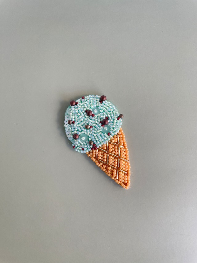 さわやかなミントグリーンが春夏のカジュアルコーデにぴったりな、チョコミントアイスのビーズ刺繍ブローチです