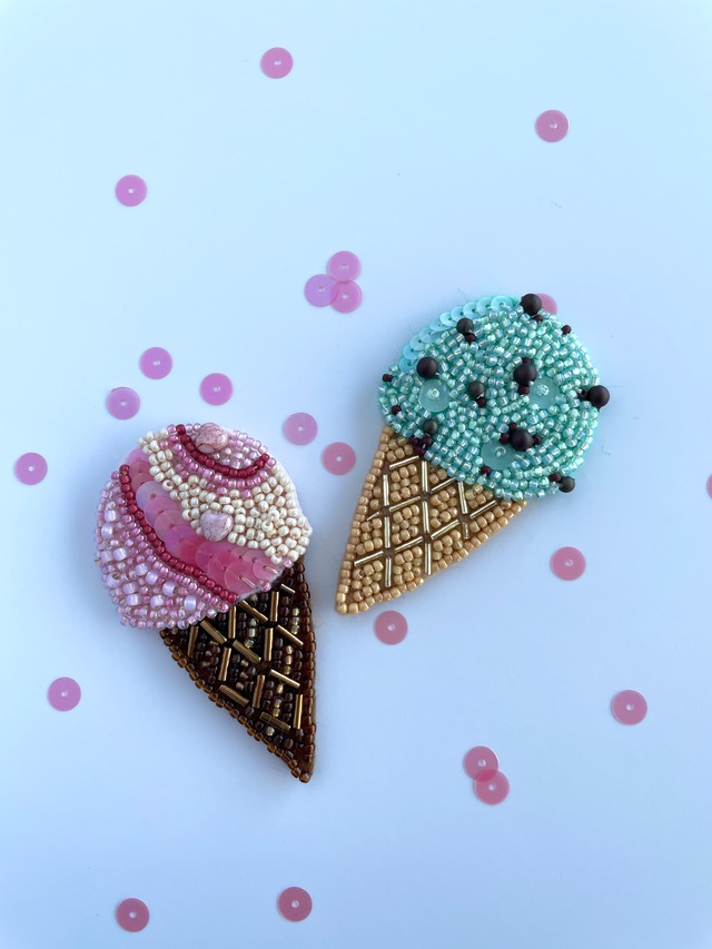 アイスには3種類のピンクのビーズといちごソース色の赤・バニラのクリーム色・微かに虹色にきらめくスパンコールを使用しています