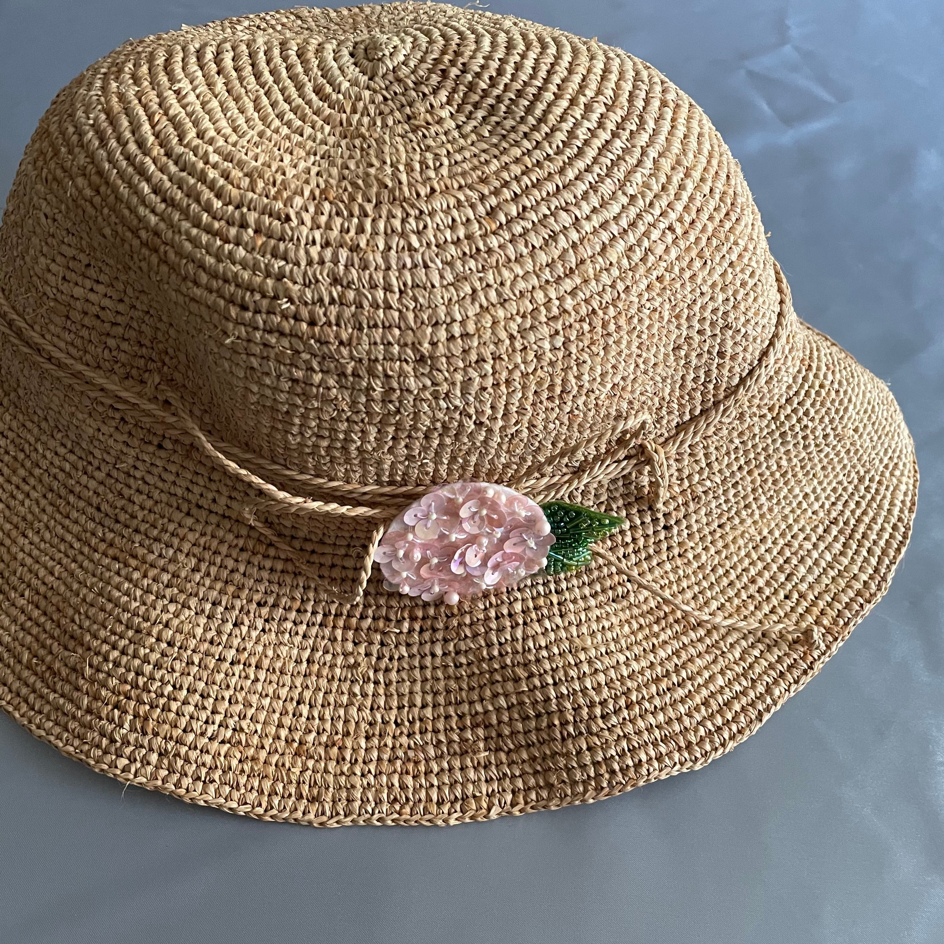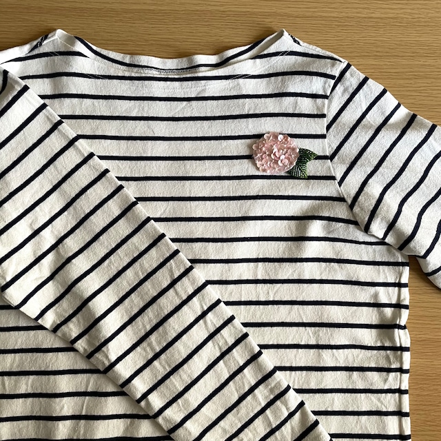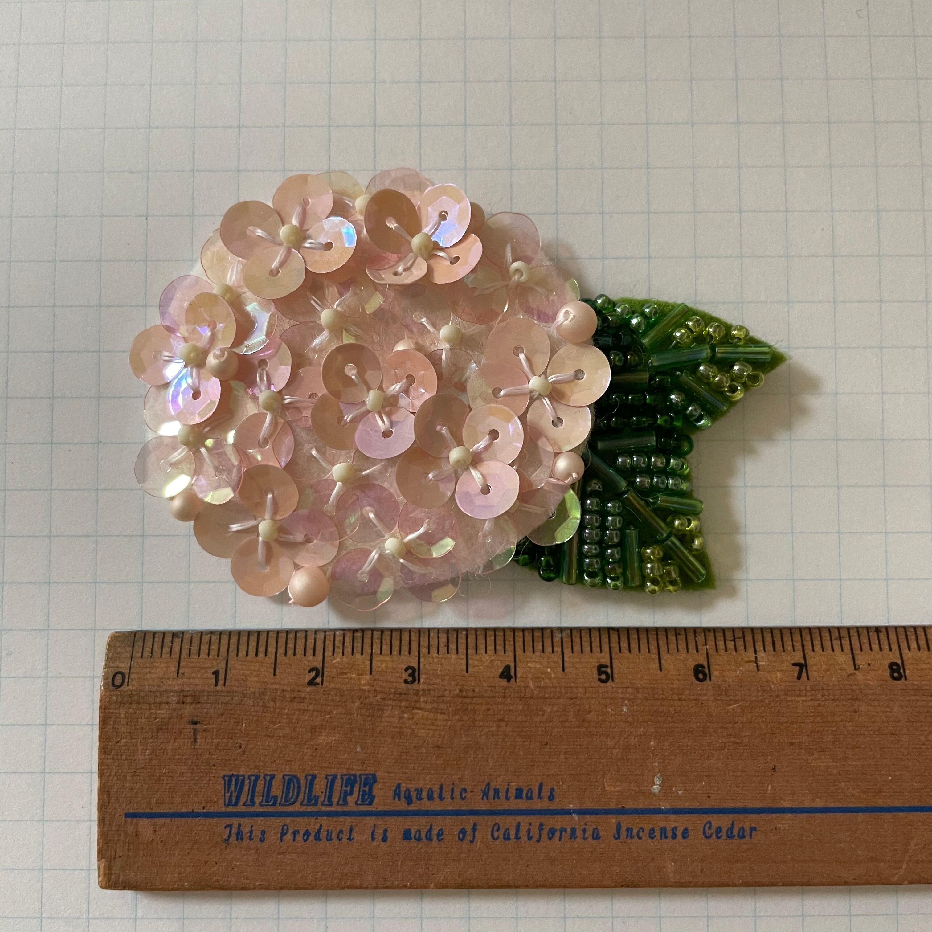 やさしいサーモンピンクと透明なピンクのスパンコールで紫陽花の花を表現しており、光が当たると虹色に輝きます