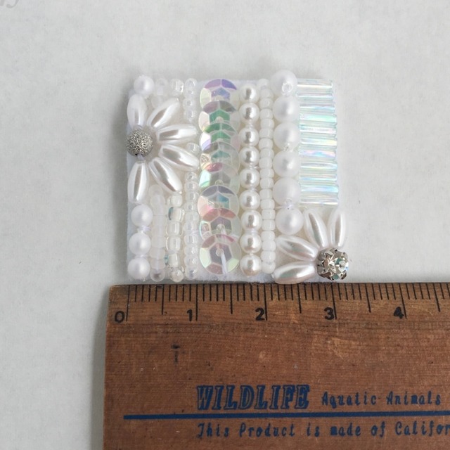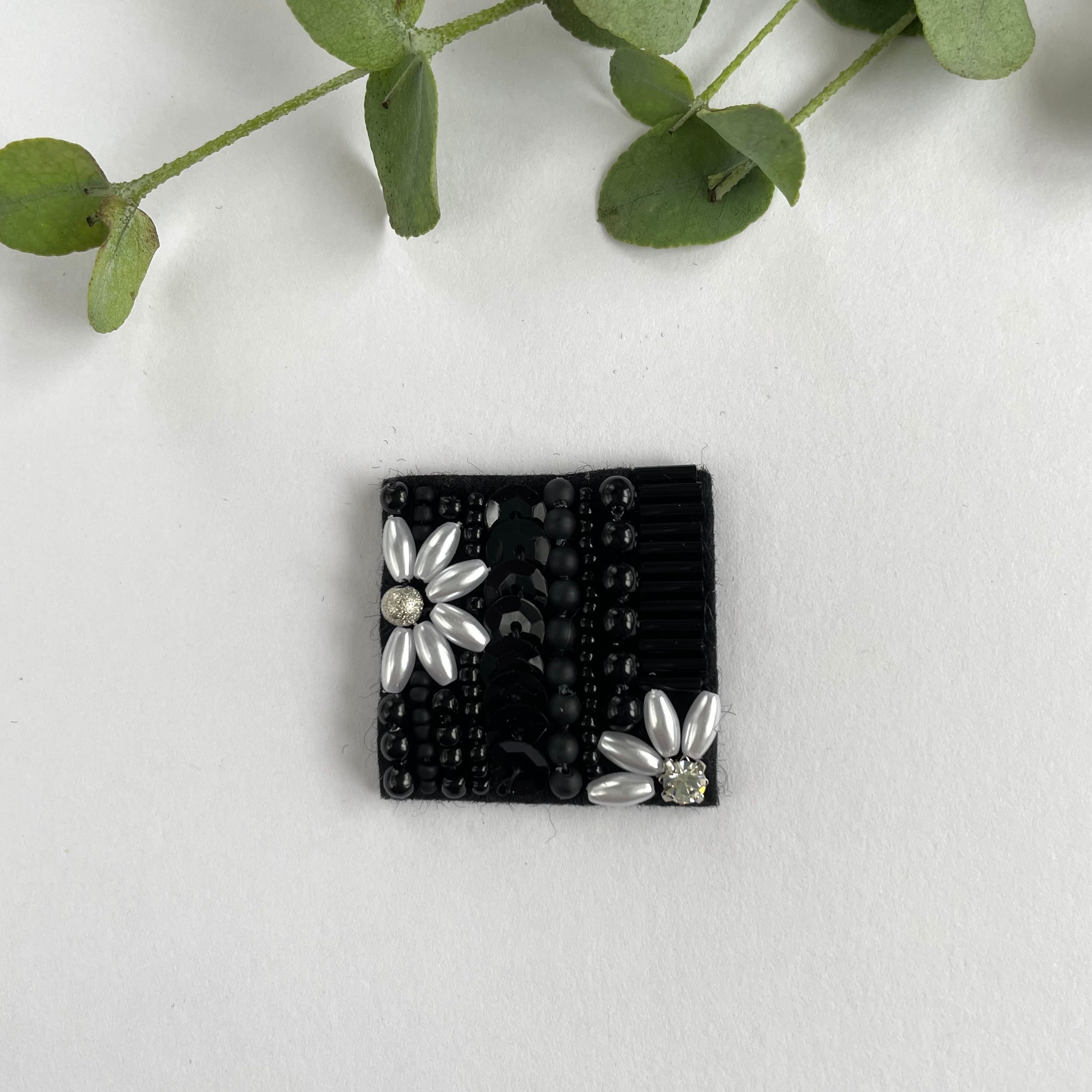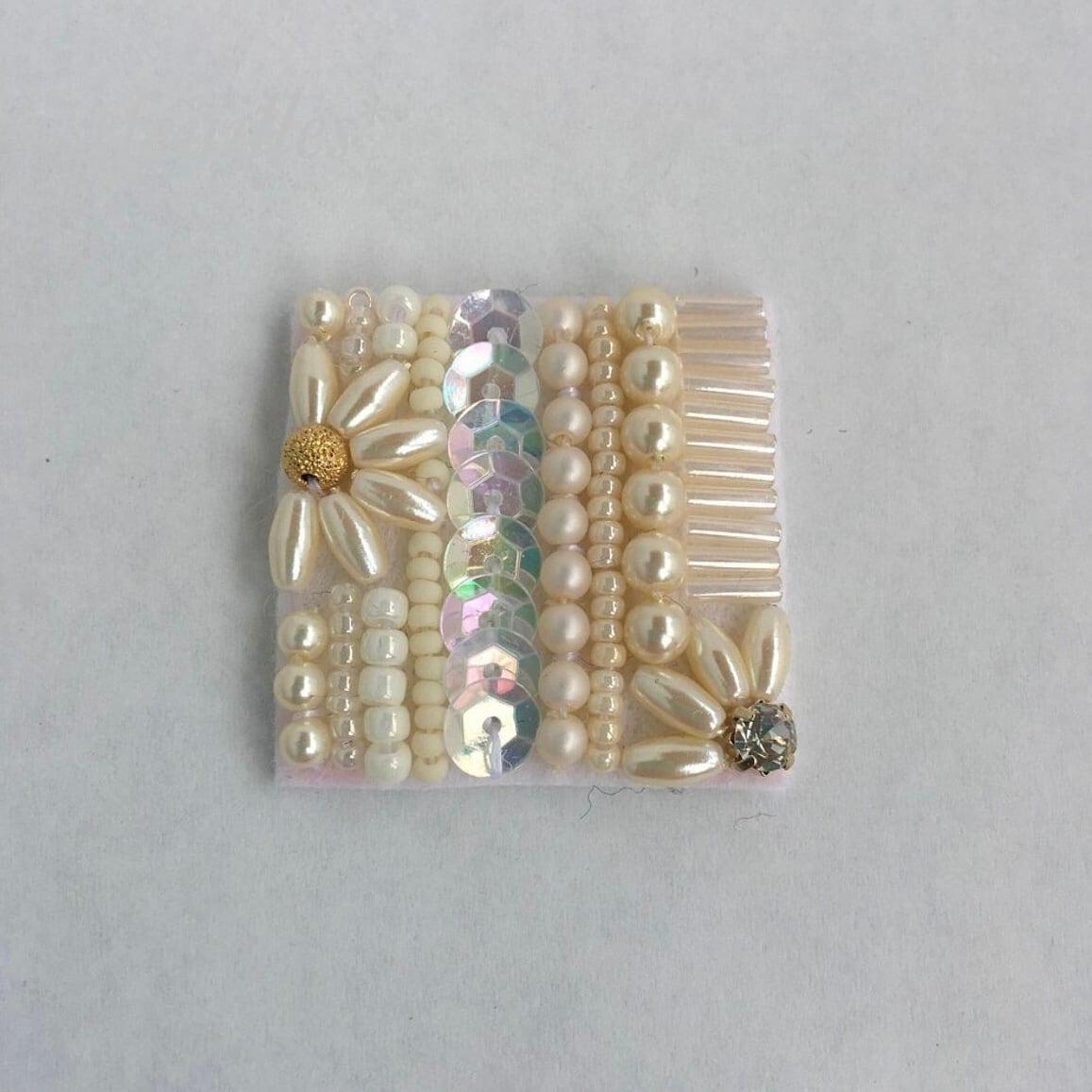 約3cmの小さな四角形の中に、レトロモダンなビーズ刺繍の世界が広がります