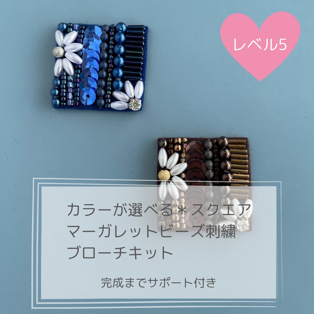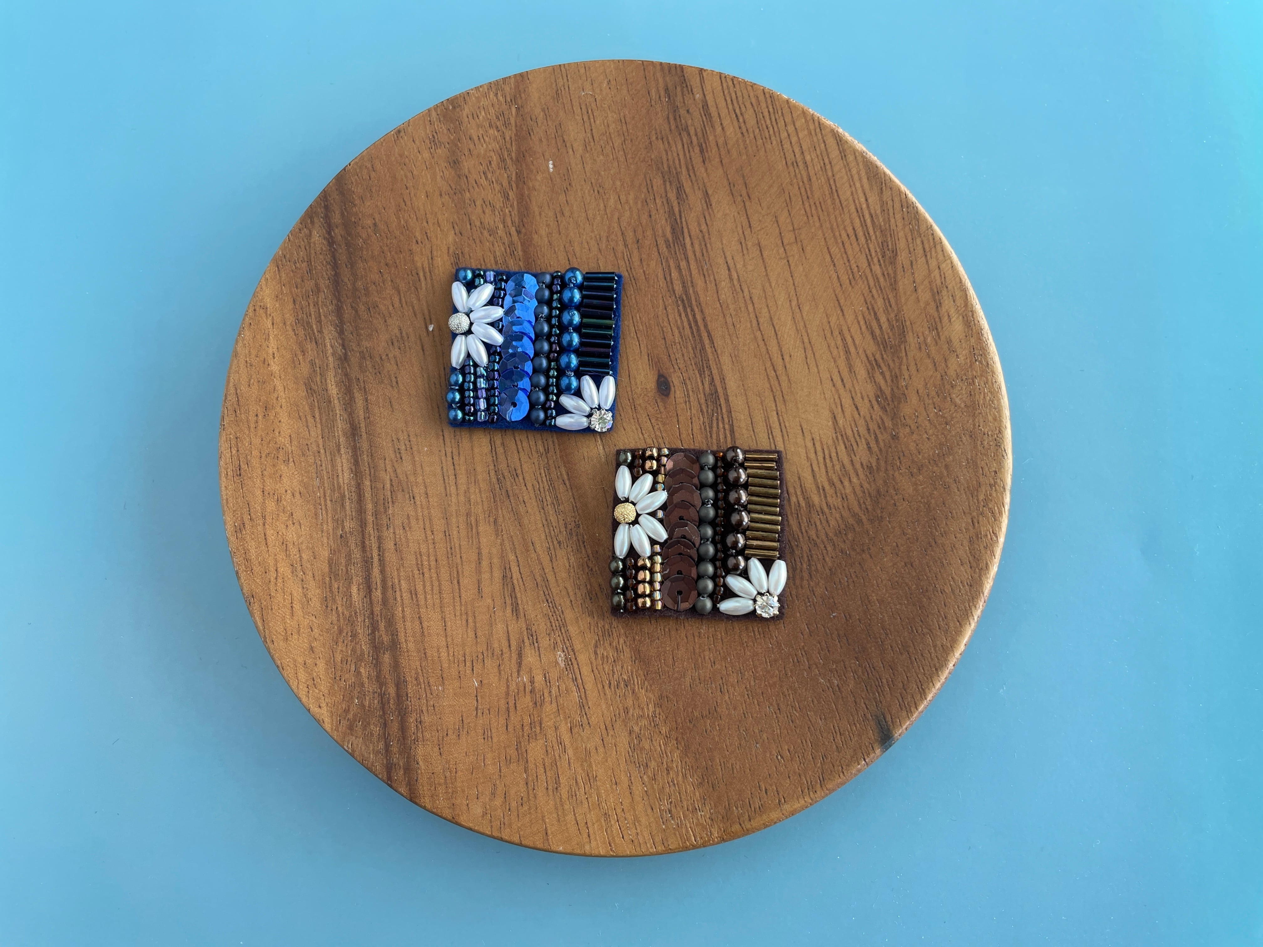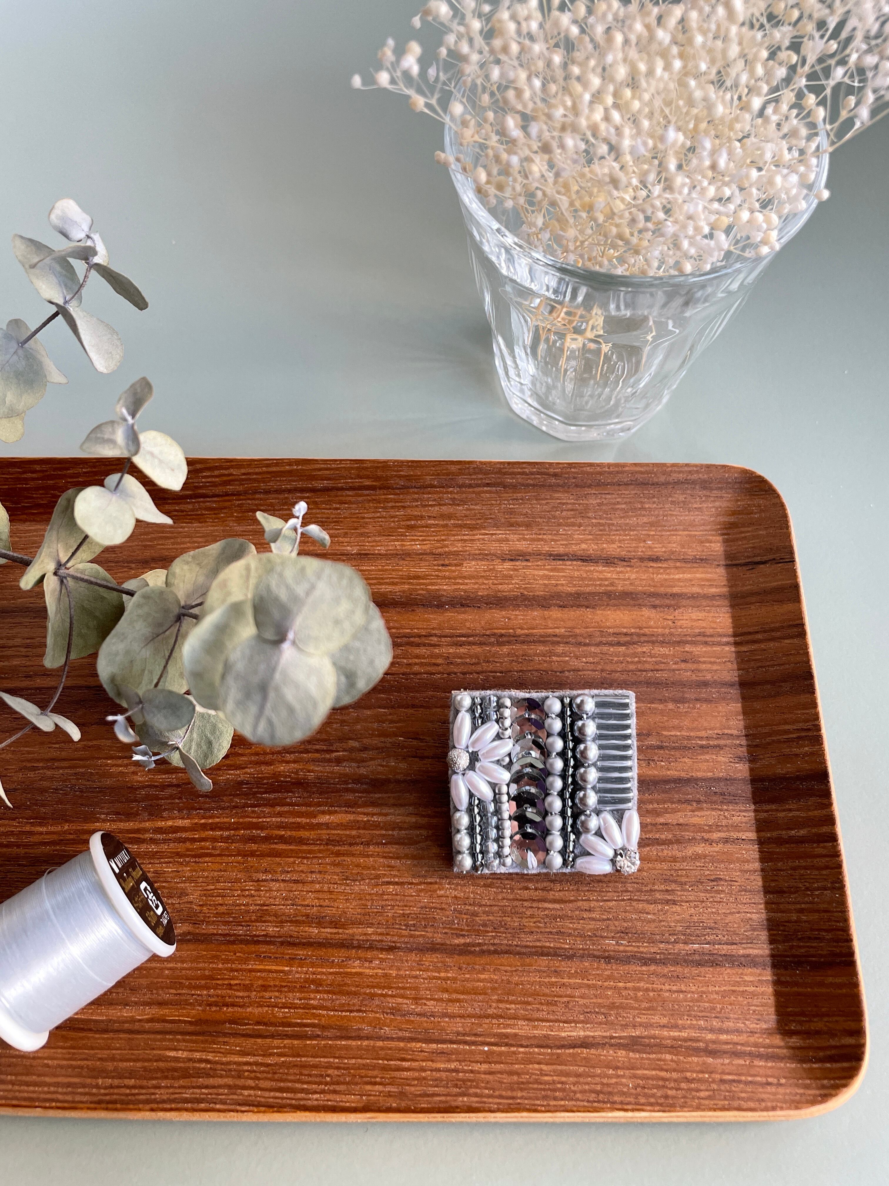 約3cmの小さな四角形の中に、レトロモダンなビーズ刺繍の世界が広がります
