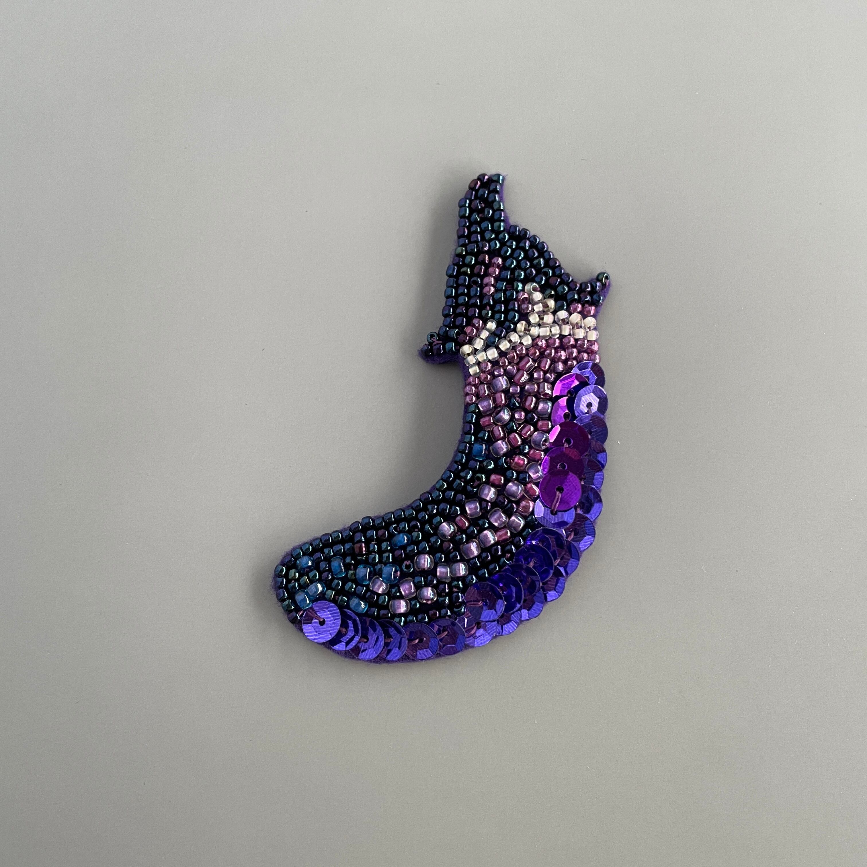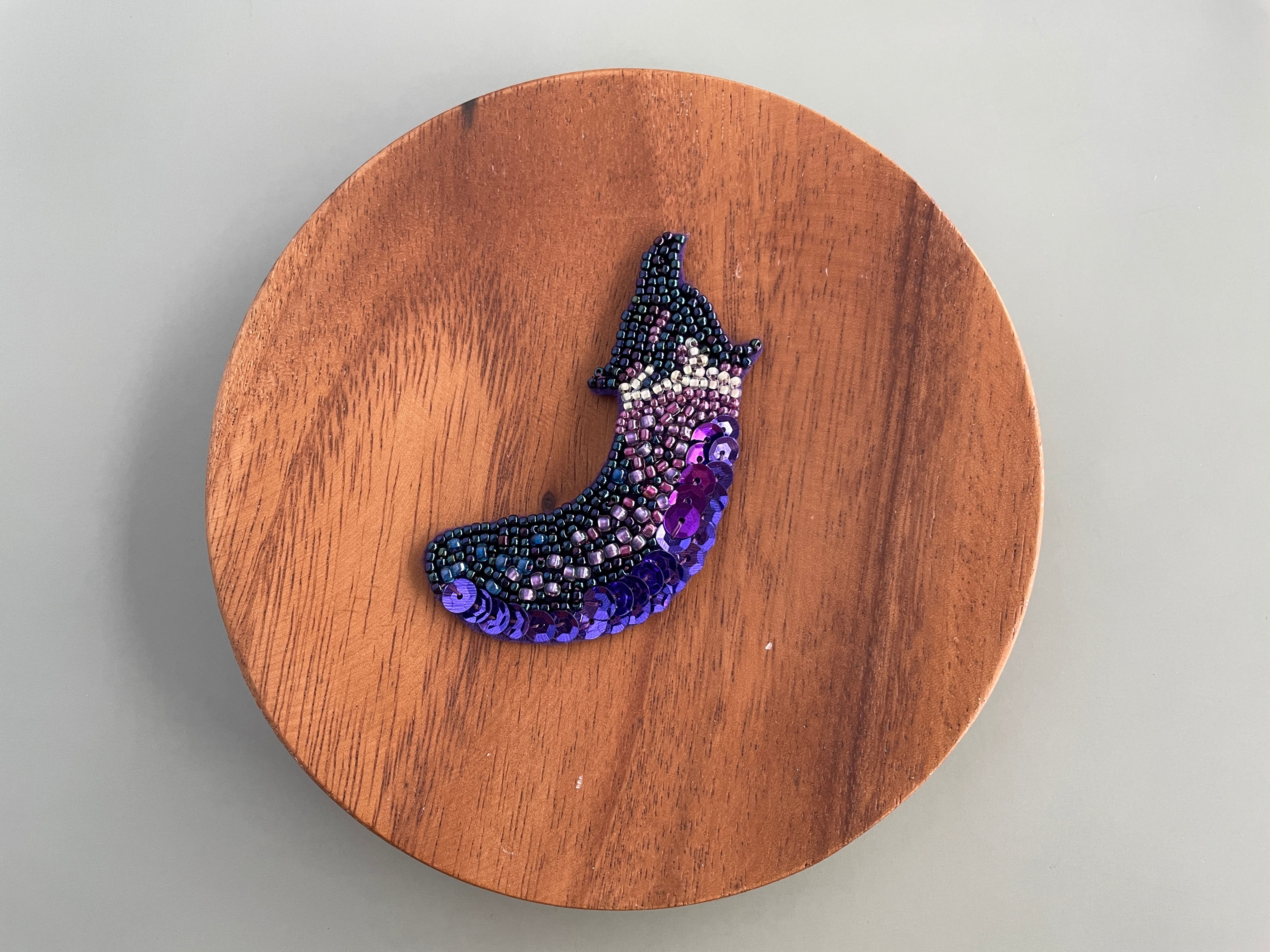 紫色のビーズのグラデーションが美しい長なすのビーズ刺繍ブローチです
